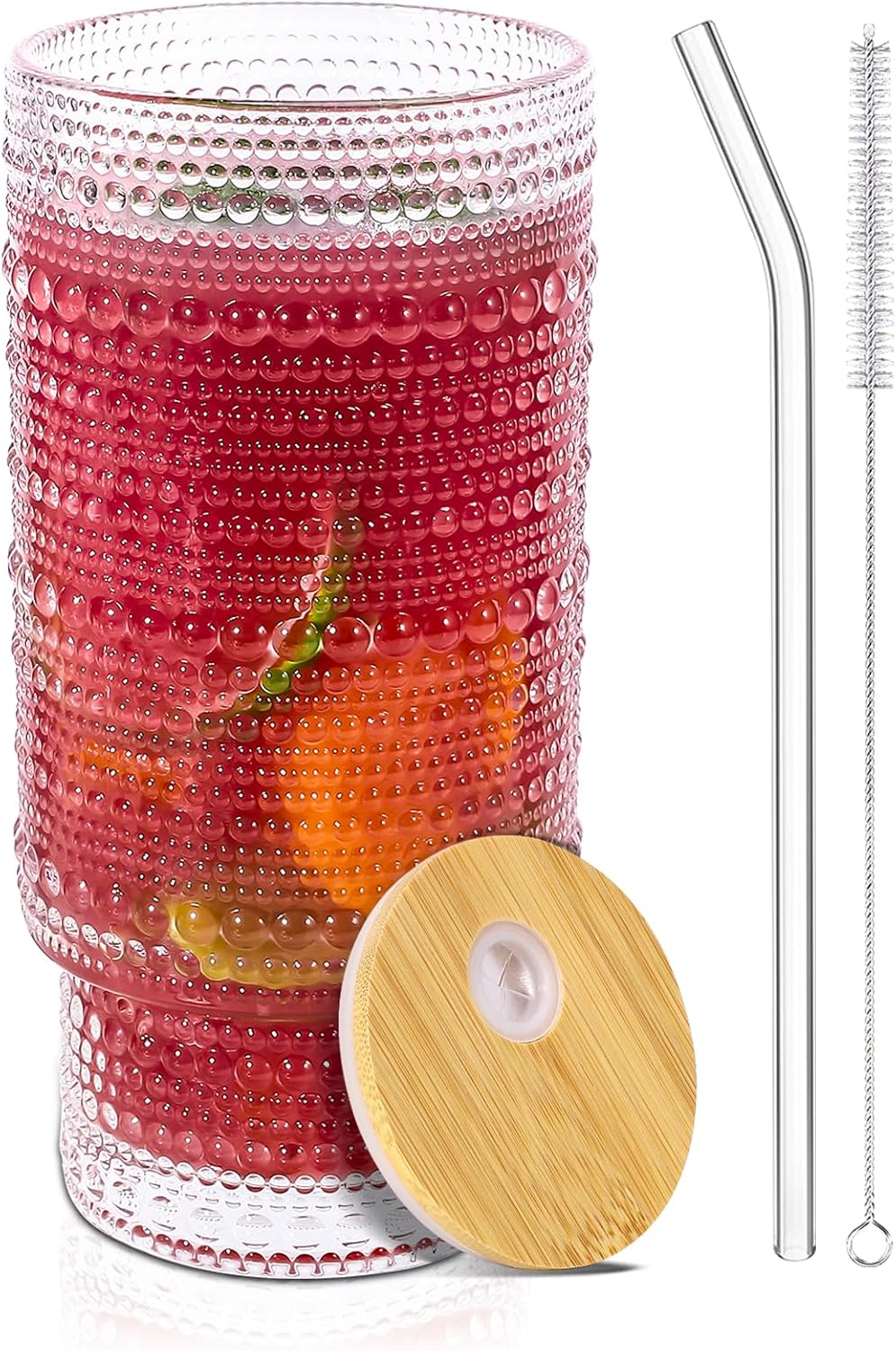 16 Oz Glass Cup with Lid and Straw, Vintage Embossed Glassware for Whiskey Cocktail Beer, Iced Coffee Cup with Lid, Glass Tumbler (1 PACK)