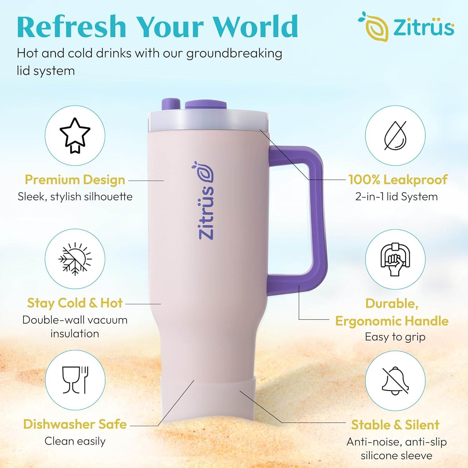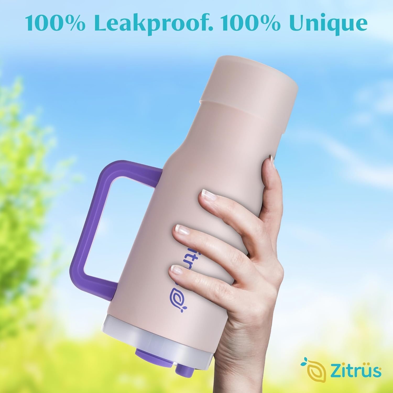 - LEFT-HAND & RIGHT-HAND FRIENDLY LID DESIGN: With a double-threaded lid, Zitrüs offers ergonomic comfort for both lefties and righties by simply adjusting the lid. Whether you're holding the handle or sipping through the straw, this insulated tumbler with handle delivers flexible hydration that fits your lifestyle. Designed to be your everyday water bottle with handle and straw.
