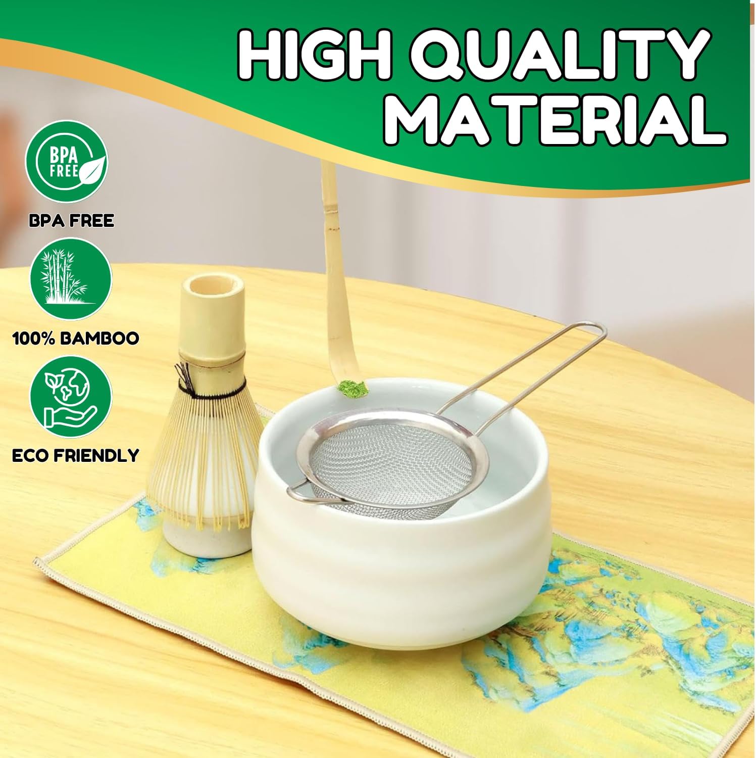 - ๐ ๐ฎ๐๐ฐ๐ต๐ฎ ๐ช๐ต๐ถ๐๐ธ & ๐๐ผ๐๐น ๐ฆ๐ฒ๐: The macha whisk set is an essential collection for matcha enthusiasts. This refined matcha bowl set includes a Japanese matcha bowl, a handcrafted bamboo whisk, a classic hooked bamboo scoop , a whisk holder, an ultra-fine stainless steel sifter, and a linen tea towel.