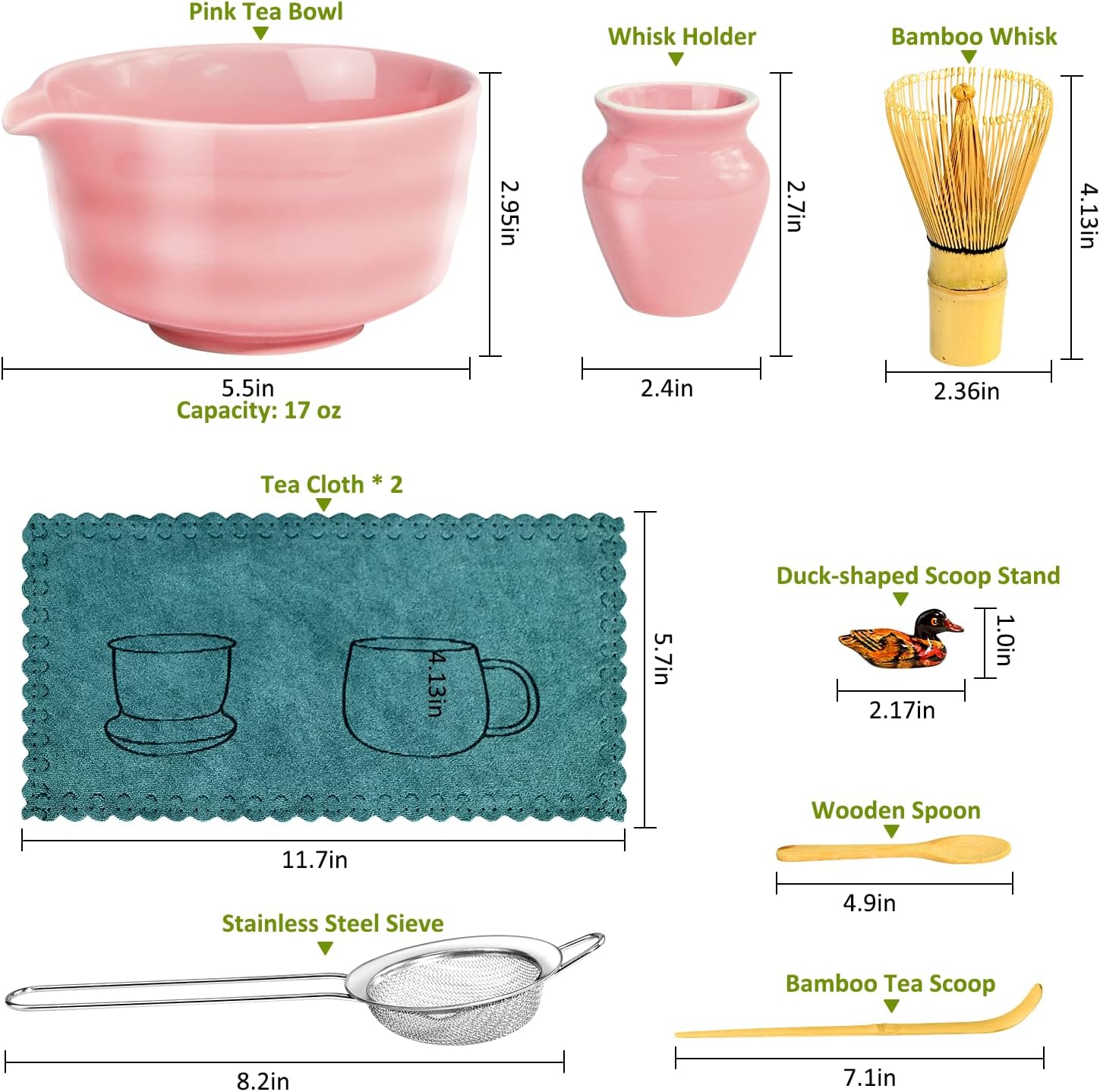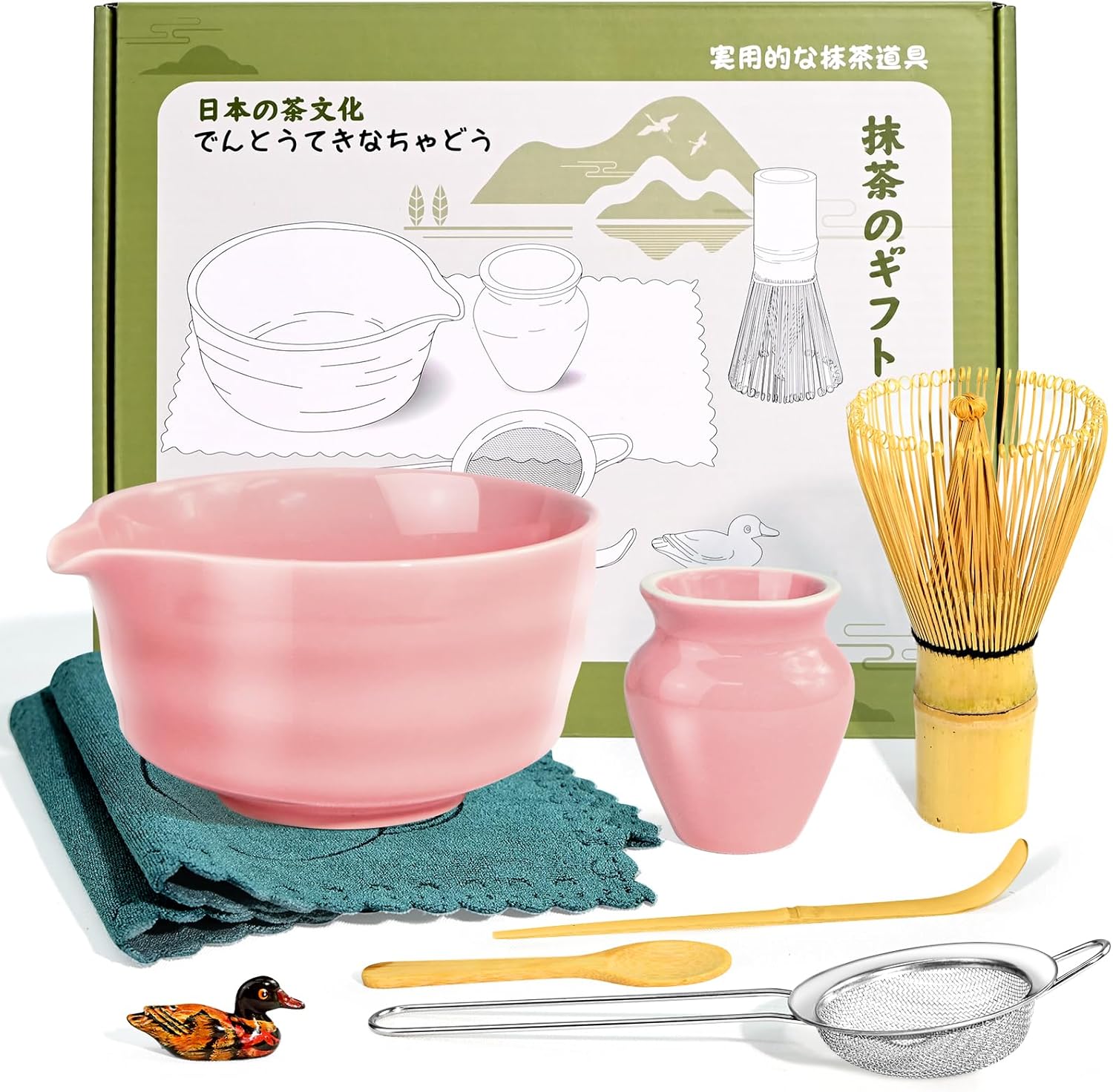 - 9Pcs Traditional Matcha Making Kit - You'll find everything you need to create the perfect cup of matcha inside. This set includes 1*17oz ceramic matcha bowl, 1*stainless steel sieve, 1*bamboo matcha whisk, 1*bamboo scoop, 1*wooden spoon, 1*whisk holder, 1*scoop holder and 2*tea cloth. This kit will take your tea experience to the next level. Just enjoy the pleasures of matcha.