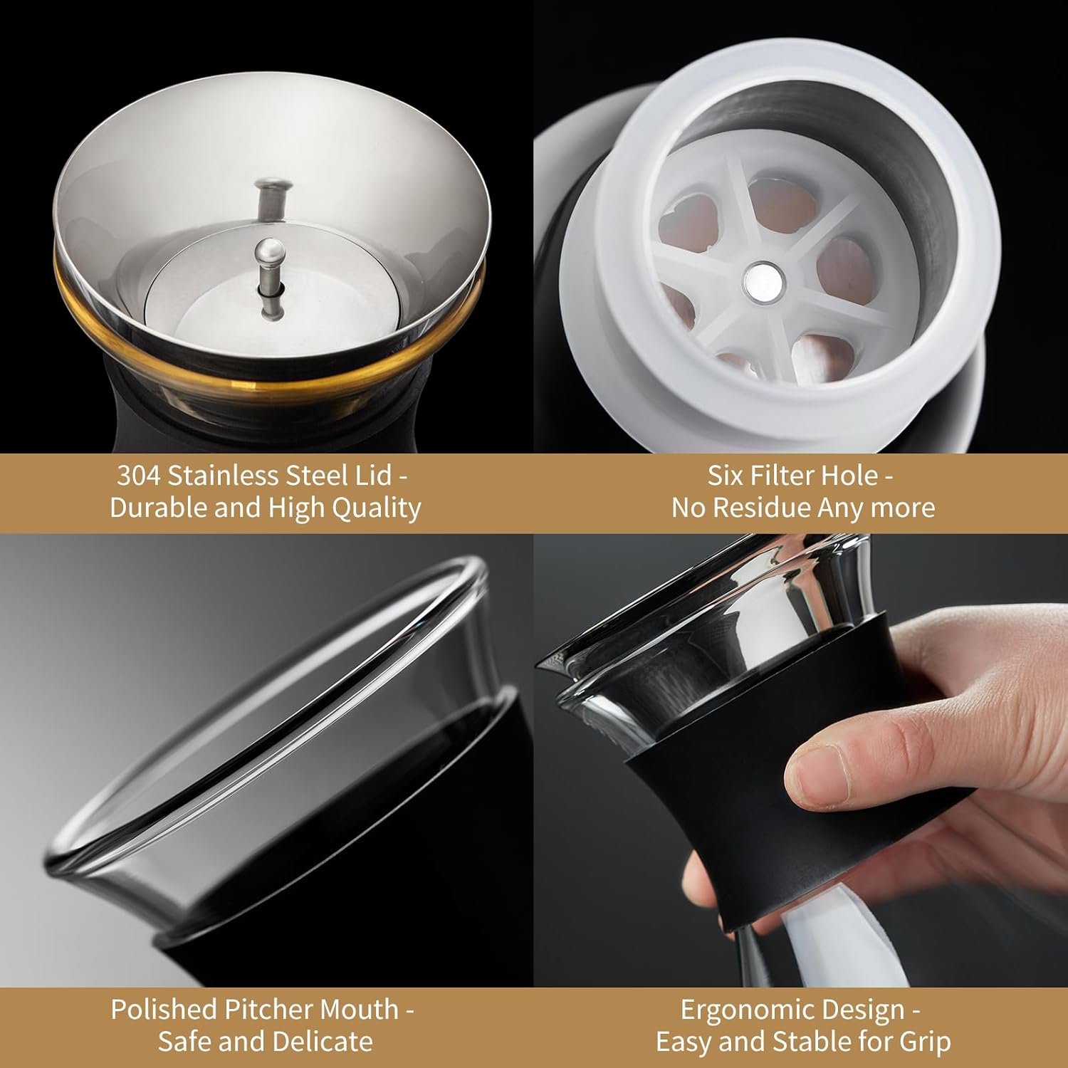 - Dual-Pour Stainless Steel Lid: The 304 stainless steel lid offers two pouring options—small holes for filtering tea leaves or pulp, and large holes for a smooth pour. Rust-resistant and built to last, it ensures versatility with every pour
