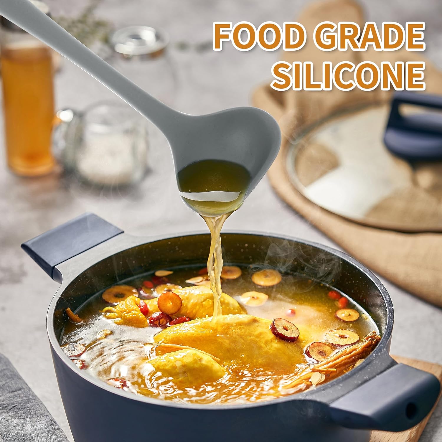 - ESSENTIAL KITCHEN TOOLS: Include Slotted spoon, Solid spoon, Soup ladle, Slotted turner, Solid turner, Spaghetti spoon, Spatula, Tongs, Whisk, Silicone mat, Basting brush(ALL Silicone) + Plastic Egg separator and Measuring spoon. Meet all kinds of kitchen needs. From beginners to skilled cooks.