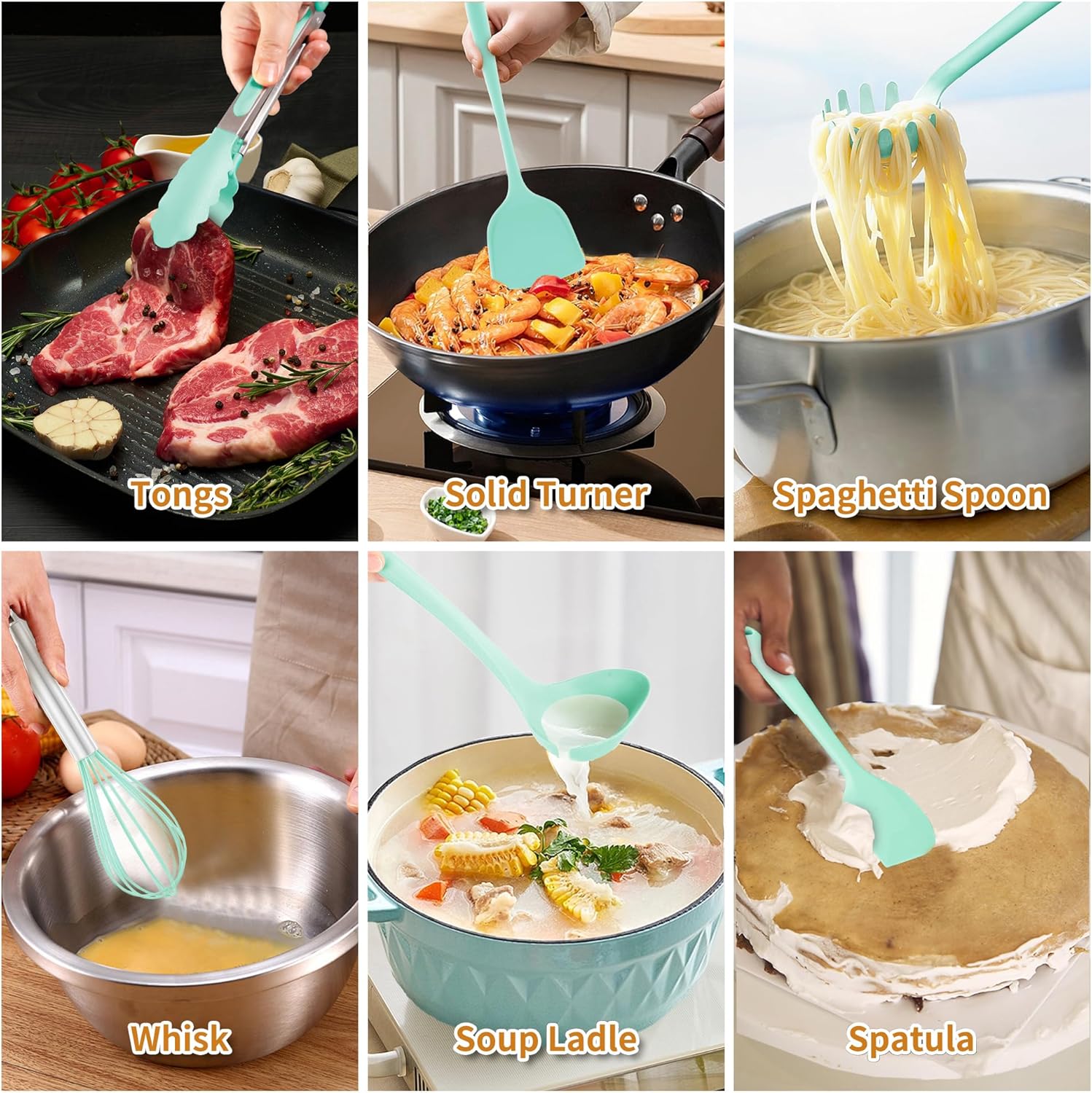 - ESSENTIAL KITCHEN TOOLS: Include Slotted spoon, Solid spoon, Soup ladle, Slotted turner, Solid turner, Spaghetti spoon, Spatula, Tongs, Whisk, Silicone mat, Basting brush(ALL Silicone) + Plastic Egg separator and Measuring spoon. Meet all kinds of kitchen needs. From beginners to skilled cooks.