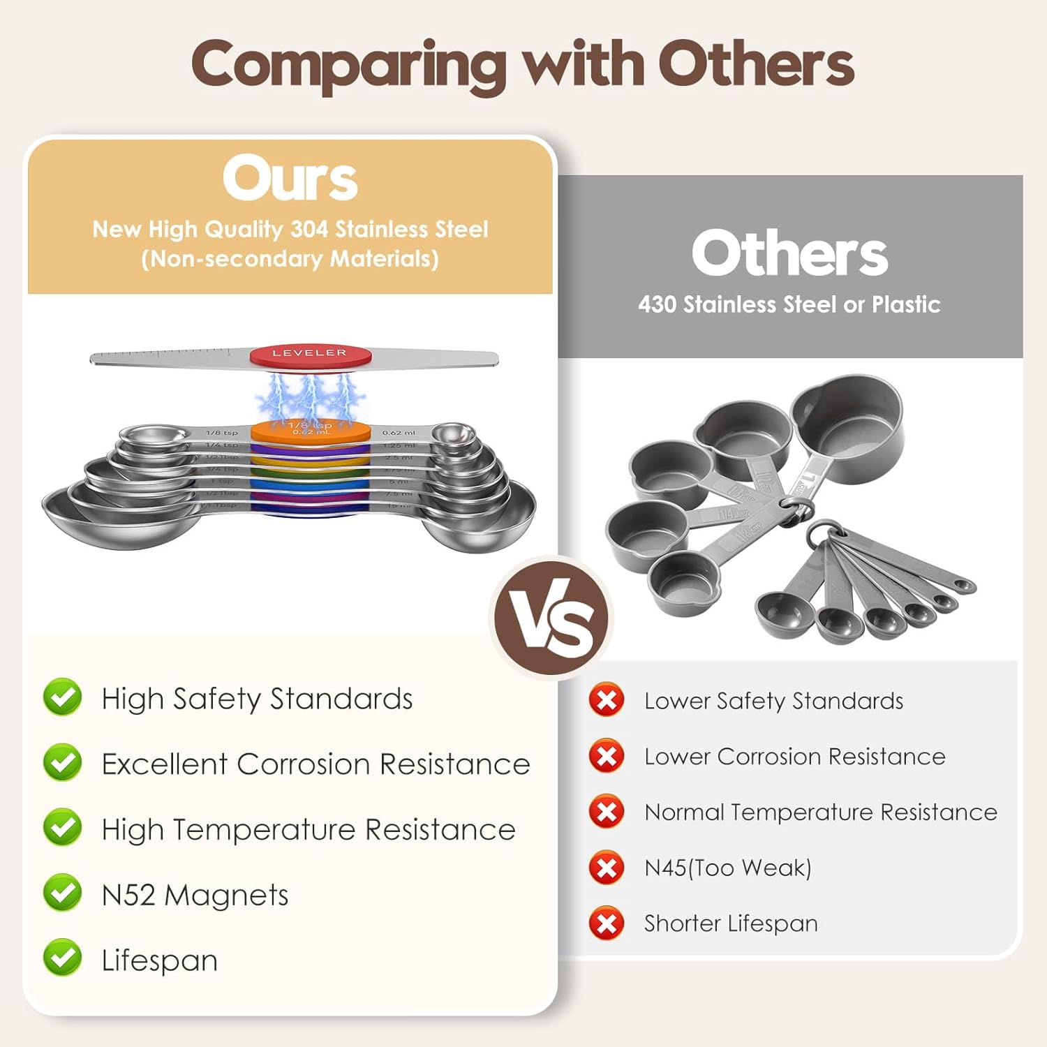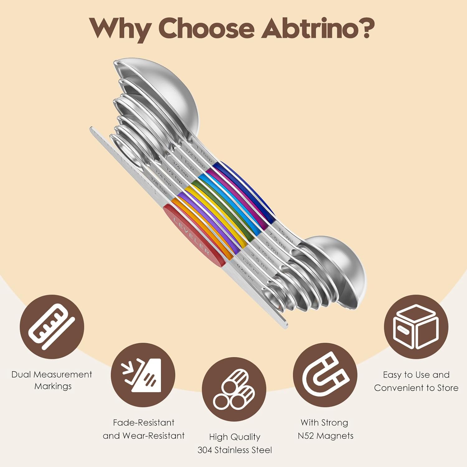 - Premium Quality & Built to Last: Crafted from heavy-duty 304 stainless steel, Abtrino measuring spoons resist rust and wear, ensuring long-lasting performance. Our EXCLUSIVE triple-marking magnetic measuring spoons set combine durability with vibrant colors. Compare the value, experience, and attention to detail - we’re confident you’ll notice the difference. It’s crafted to add both style and function to your kitchen, making it an ideal choice for both home cooks and professional chefs.