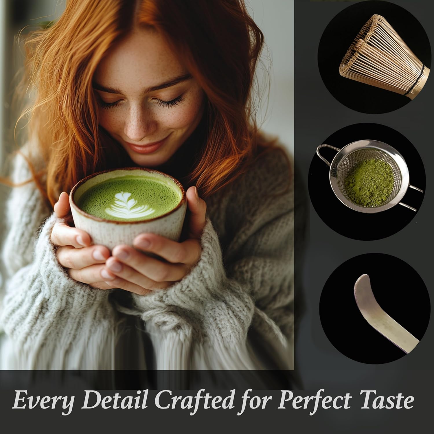 - Premium, Natural Materials – The bamboo whisk and scoop are handcrafted from 100% natural bamboo, free from harmful chemicals, for an authentic matcha experience. The stainless steel sifter ensures a smooth texture for your matcha powder, while the entire set is lead-free and food-safe for peace of mind.