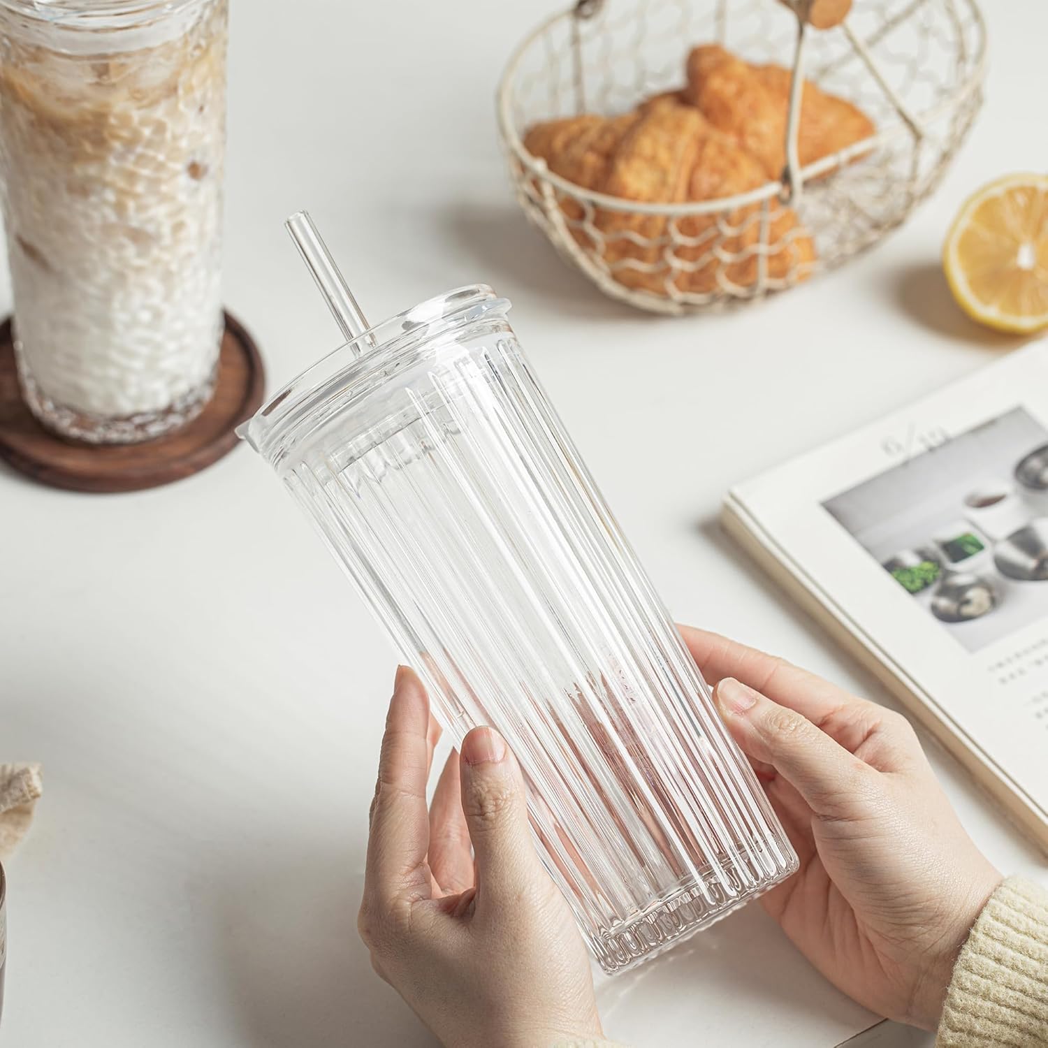 KEMORELA Ribbed Glass Tumbler with Straw and Lid – 18oz Durable Leak-Proof Drinking Cup for Hot and Cold Beverages – Stylish Design, Ideal for Iced Coffee, Smoothies, and More (2PCS-A)