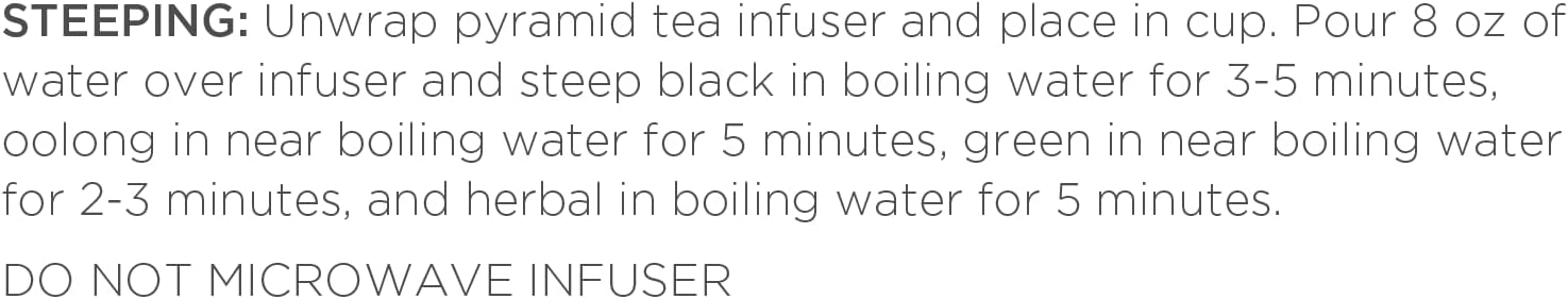 - HOW TO STEEP - Unwrap the Pyramid Infuser, steep in hot water, and reveal the exquisite nature of the whole leaf teas. Allows the tea leaves to fully unfurl in the water, resulting in a most flavorful cup of tea. Do not microwave pyramid infuser.