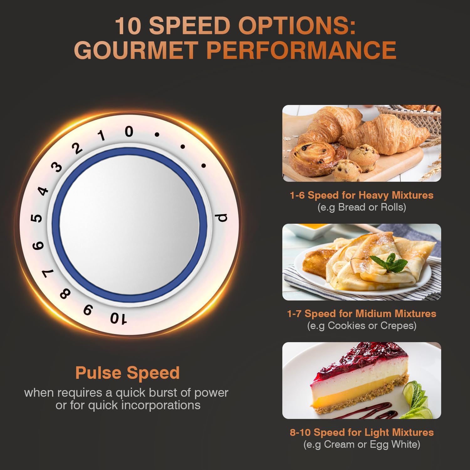 - ăUpgrated DC Motor System ăMini Angel stand mixers adopt all metal gear structure, with closed gearbox, effectively reduce the sound, speed running stable without stalling with can long service life. And the planetary mixing system which functions more touch points per rotation during mixing process, so that all the mix is stirred at a full extent.