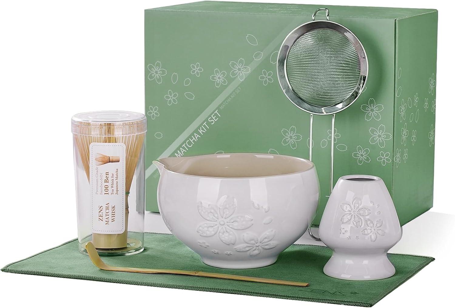 ZENS Matcha Whisk Set, Ceramic Matcha Set Includes 15oz Sakura Bowl, Bamboo Whisk & Chasen Holder, Scoop & Sifter-Tea Towel, 6pcs Matcha Kit for Matcha Lovers, White