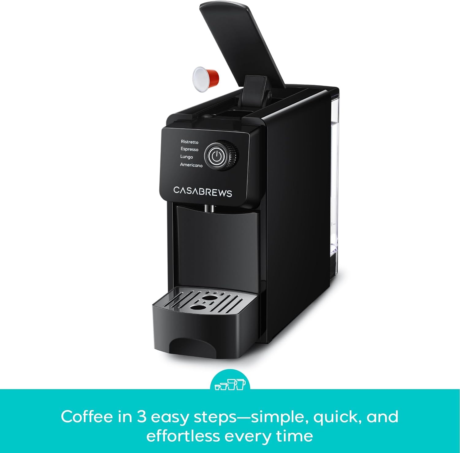 - Sleek & Space-Smart Design: Ultra-slim 3.9-inch width fits anywhere. 21oz removable water tank brews up to 12 cups, while the 8-capsule container reduces frequent emptying. Portable enough for travel or tiny kitchens!