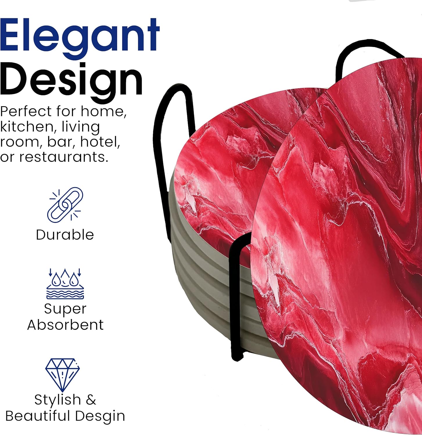 - Light Dark Red Maroon Multicolored Agate Slate or Marble Design Set of 6 Ceramic Coasters with Stand – Includes six stylish, 4-inch round drink coasters paired with a sleek metal stand for convenient storage, keeping your coasters neatly organized and within easy reach. Marble Pattern Coaster Set Makes a Great Gift - CST50