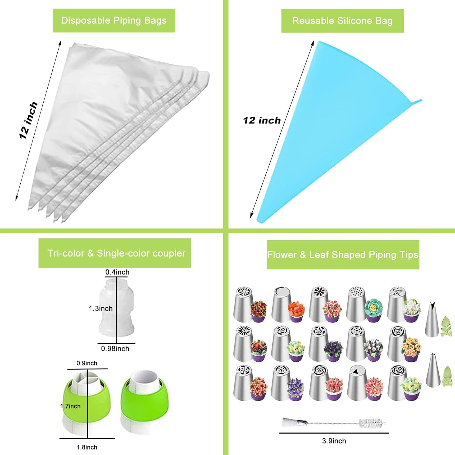 - 【32-Piece Cake Decorating Kit】 This frosting piping kit includes 17 russian piping tips, 1 standard coupler, 1 three-hole coupler, 1 one-hole coupler, 10 disposable piping bags, 1 reusable piping bag, and 1 cleaning brush. Perfect for decorating cakes, cupcakes, cookies, and bread, this set meets all your baking decorating supplies needs.