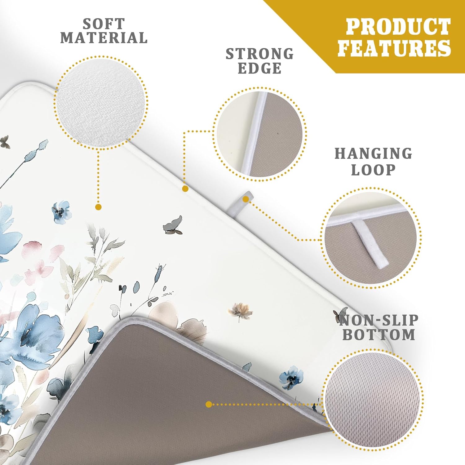 Giwawa Watercolor Floral Dish Drying Mat, 18"x24" Blue Grey Brown Flowers Kitchen Drainer Mats, Spring Summer Wildflower Microfiber Large Dish Drying Pad for Countertop Tabletop Decoration