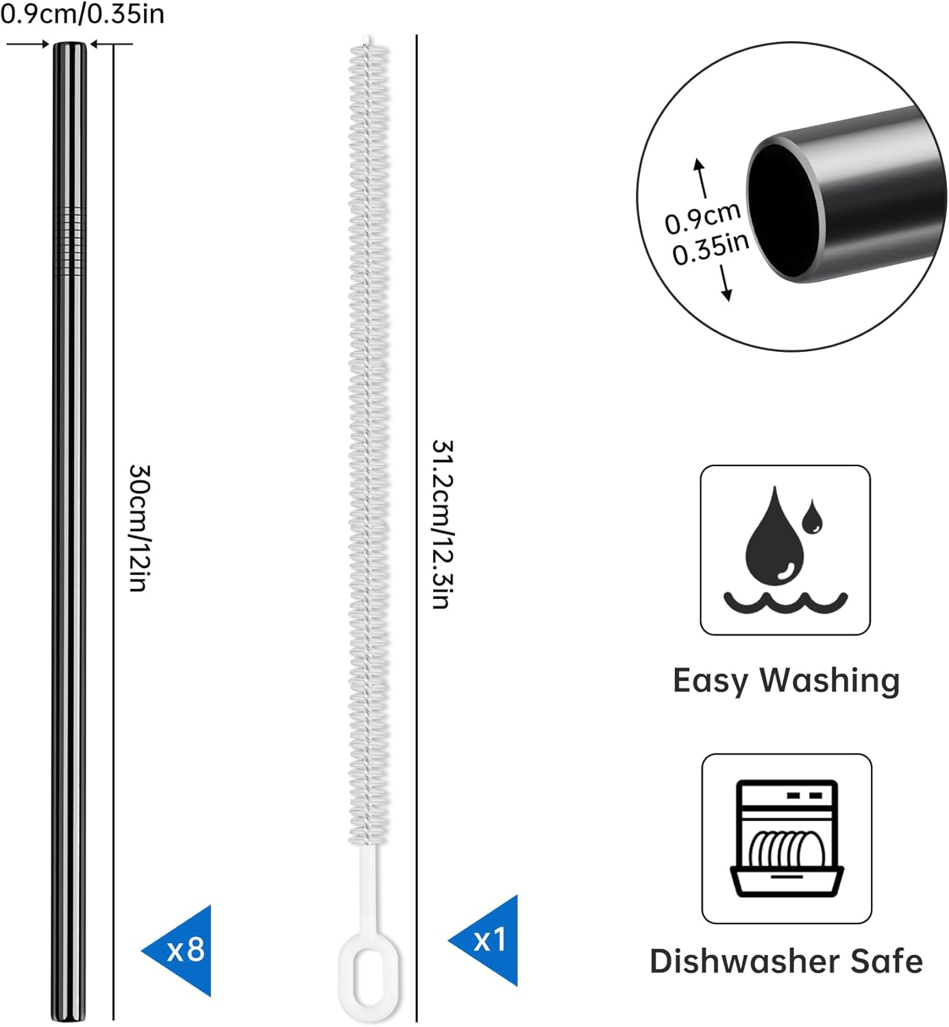 - Value Set: Includes 8 reusable extra-long metal straws (12" x 0.394") and 1 bonus cleaning brushāperfect for home, travel, and daily use.
