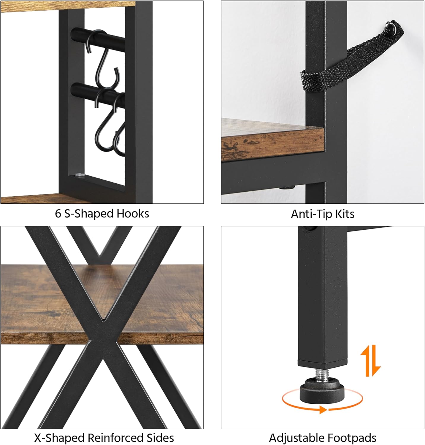 - X-design Metal Frame: The X-shaped sides not only add a unique touch to the kitchen rack's appearance but also enhance its overall strength and stability, making it a reliable storage solution