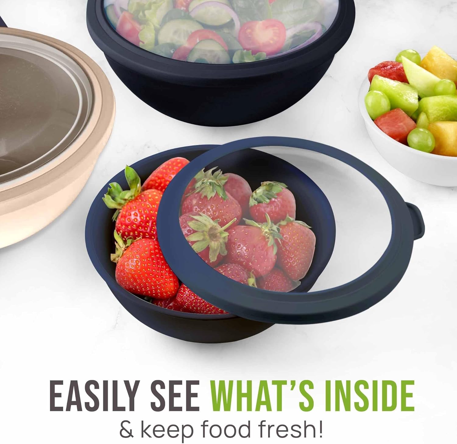 - KEEPS FOOD FRESH: These kitchen mixing bowls come with tight fit lids that prevent the air from getting in and out and also allow transporting food without any spills. The transparent plastic material allows you to take a peek at the food without opening it every time.