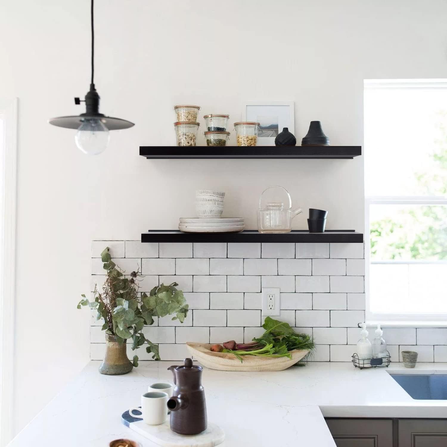 Meangood Floating Shelves Black 17 inch Wall Mounted Natural Bamboo Wood Wall Storage Shelves for Bedroom,Living Room,Bathroom, Kitchen(Set of 2)