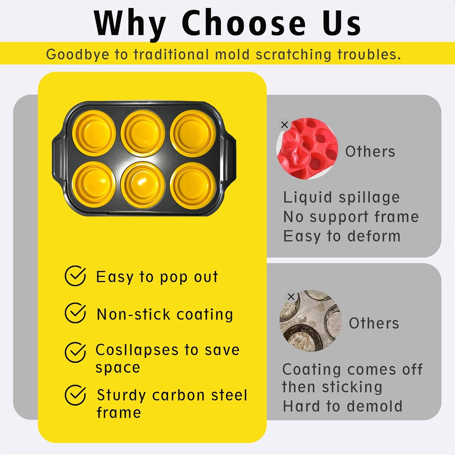 Silicone Muffin Pan Set, 6 Cups Cupcake Pan, With Metal Frame Nonstick Press to Easily Pop Out for Baking Homemade Muffins,Breads, Cupcakes, Egg Bites, BPA-Free Silicone (Yellow, 6Cups)