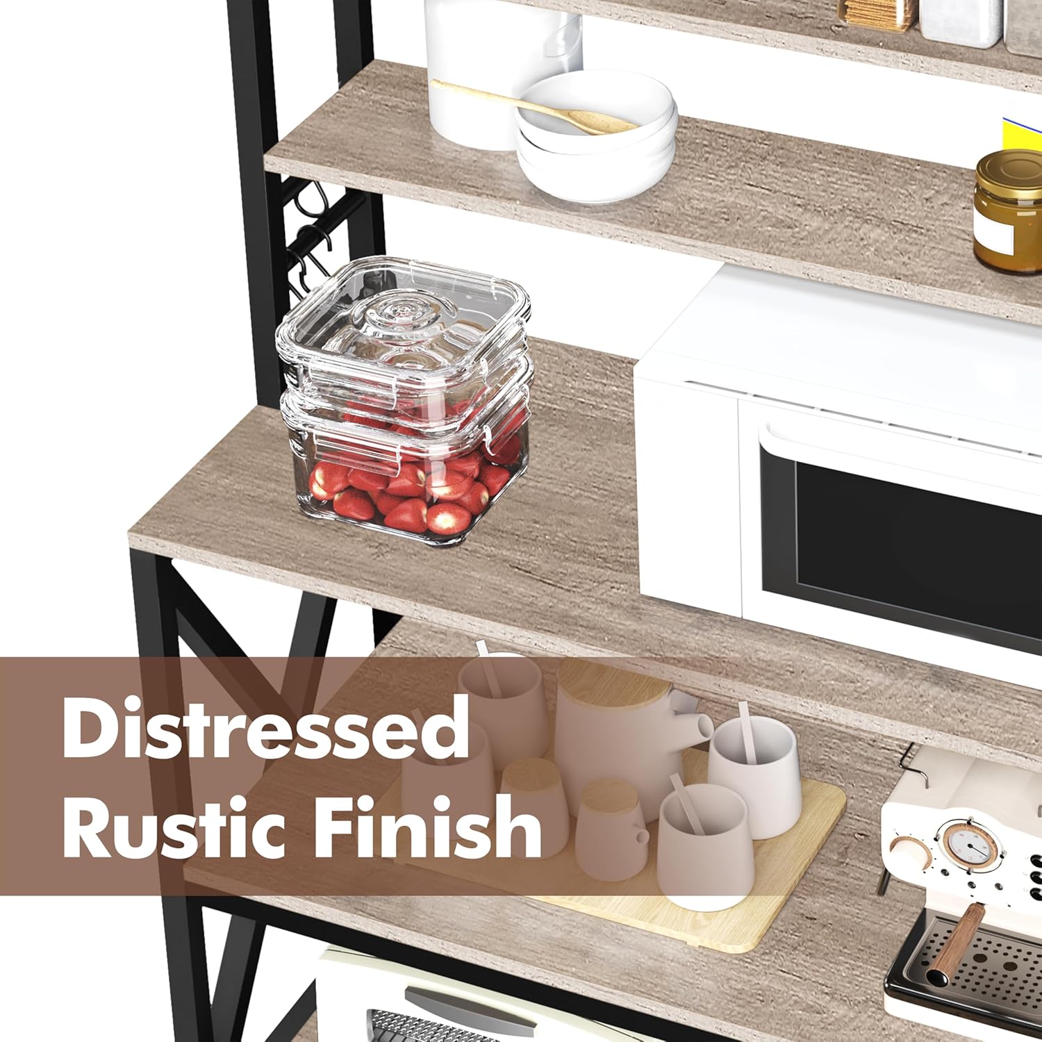 - Functional Shelving & Hooks: This bakerās rack features three small shelves for jars and spices, three large shelves for microwave and kitchenware, and six hooks for towels and kitchen gloves, offering exceptional functionality