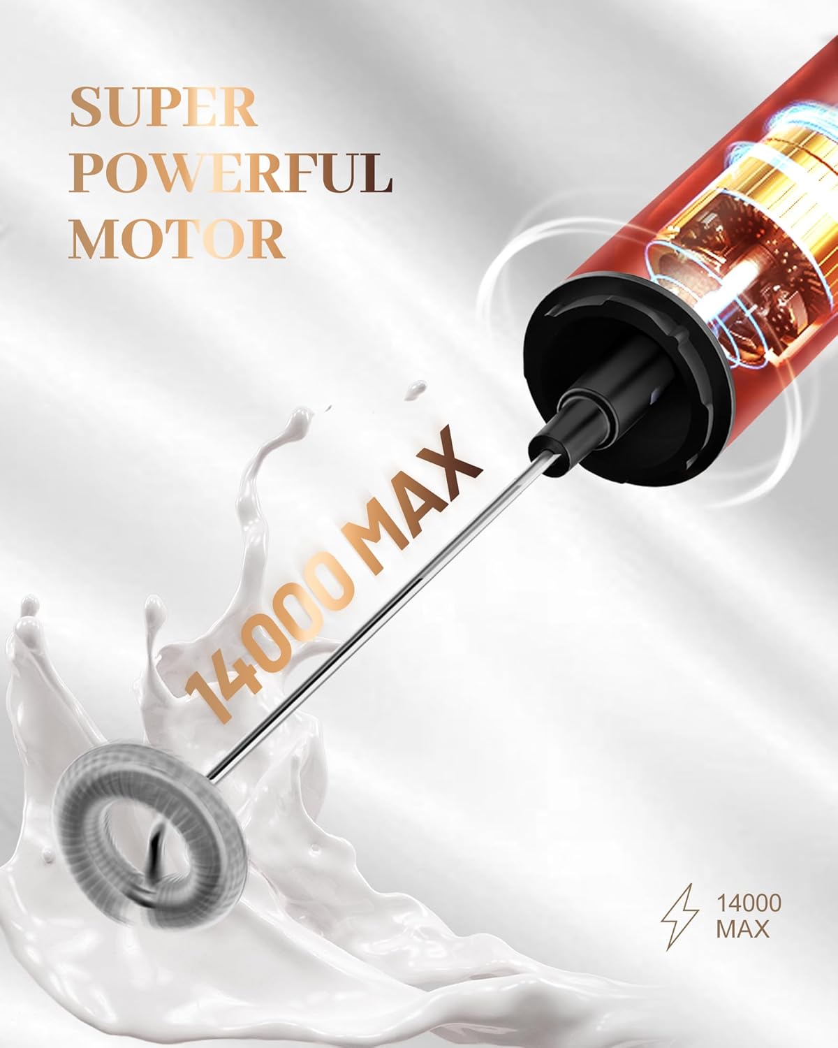 - Powerful Coffee Frother: Engineered by our expert team, it features a high-power turbocharged motor with a maximum speed of 13,000 RPM ±10%. It can whip up smooth, delicate coffee in just 15 seconds. For morning coffee enthusiasts, this elegant frother lets you top your coffee with velvety foam at lightning speed, even on the busiest mornings