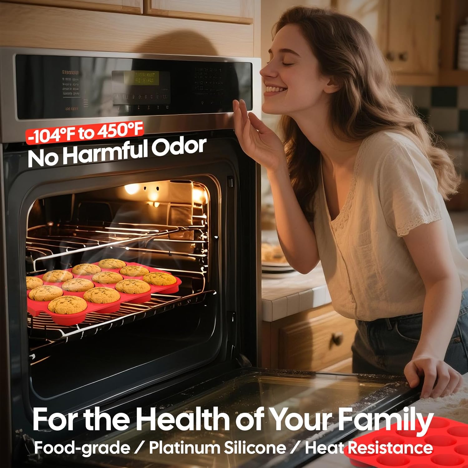 - 【PERFECT NONSTICK RELEASE & EASY CLEANING】 Experience effortless baking and cleanup! Our muffin pan is made from premium food-grade silicone with an ultra-nonstick surface. Your muffins, cupcakes, or brownies pop out perfectly in one piece, every time. After baking, simply rinse with water or place it in the dishwasher for a hassle-free clean. No more scrubbing or soaking