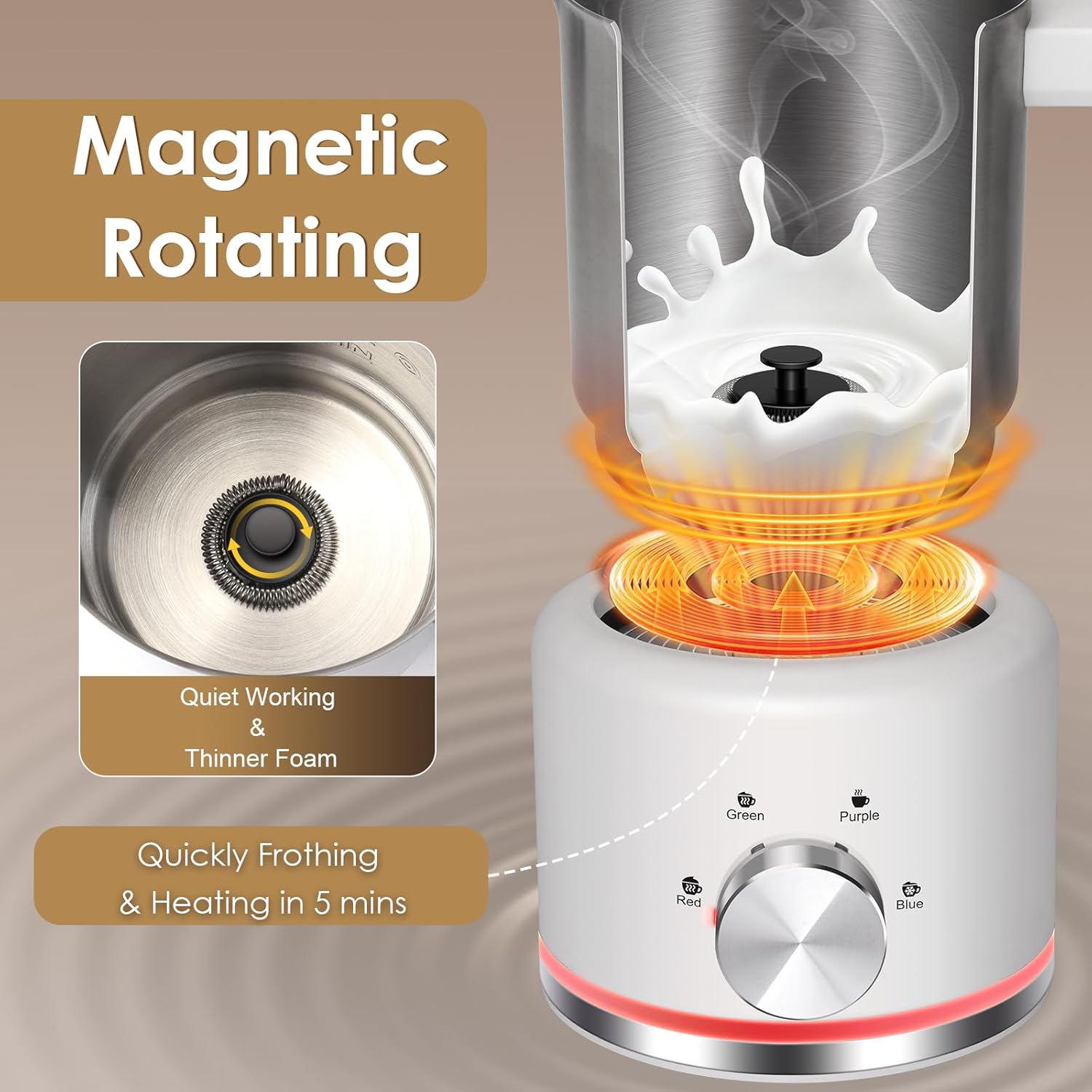 - ๐๐๐ ๐ง๐๐ญ๐ข๐ ๐๐จ๐ญ๐๐ญ๐ข๐ง๐ ๐๐๐๐ก๐ง๐จ๐ฅ๐จ๐ ๐ฒ-The rotating whisk inside the milk frother electric's container to spin and agitate the milk, introducing air and creating foam, that makes stable and consistent frothing what brings consistent agitation, the milk foamer for coffee ensures the foam tinier than other traditional milk frother. Compared to other milk frother, the magnetic rotation technology minimizes the friction between the whisk and the container, improving durability, and making the frother run more quietly.