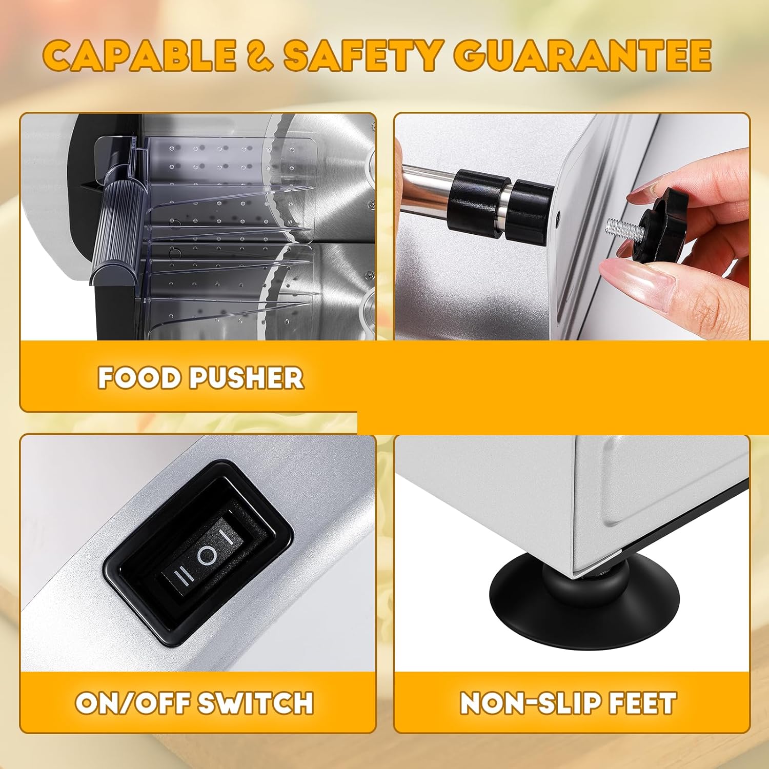 - Dual Blades for Any Task: The Food Slicer includes serrated blade and smooth blade, serrated blade is suitable for frozen meat, deli meat, bread or other a little hard food, smooth blade is perfect for chesse, fruits, vegetables and so on.