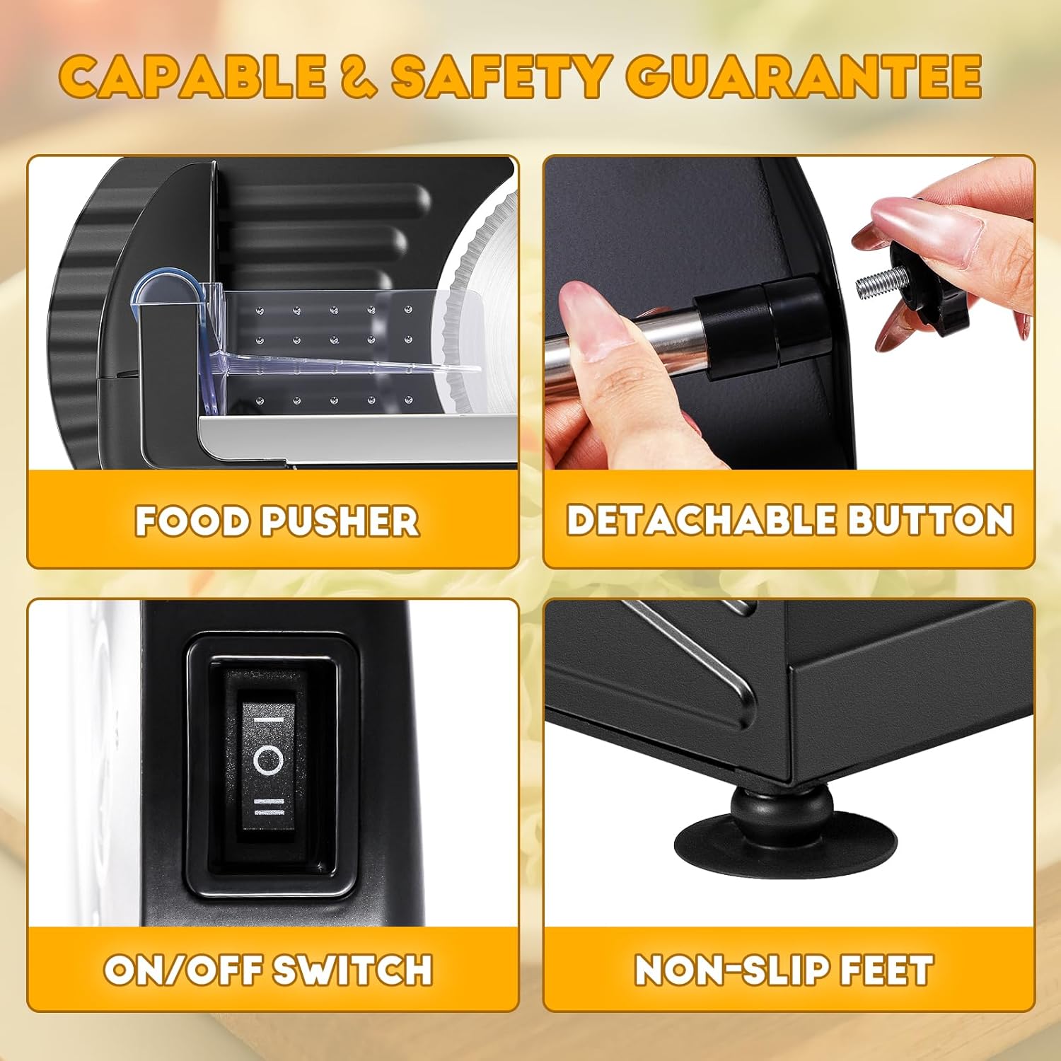 - Perfect Design: The Electric Slicer is made from premium-quality die-cast aluminum, which is not only super-durable, but also rustproof and easy to clean. Non-slip suction cup feet keep the Deli Slicer stable while working, and the food pusher also acts as a blade guard to help keep your fingers safe. The on/off switch provides added safety. With its compact design, this Deli Slicer is small enough for most cabinets and countertops.
