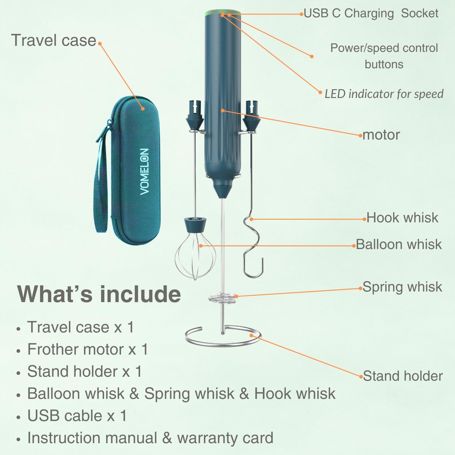 - 【Enjoy creamy froth in seconds】 With VOMELON milk frother handheld, you can whip up smooth and silky milk foam for your favorite beverages in minutes. Whether you want to make a latte, cappuccino, hot chocolate or protein shake, this electric whisk will help you create a rich and delicious foam every time.