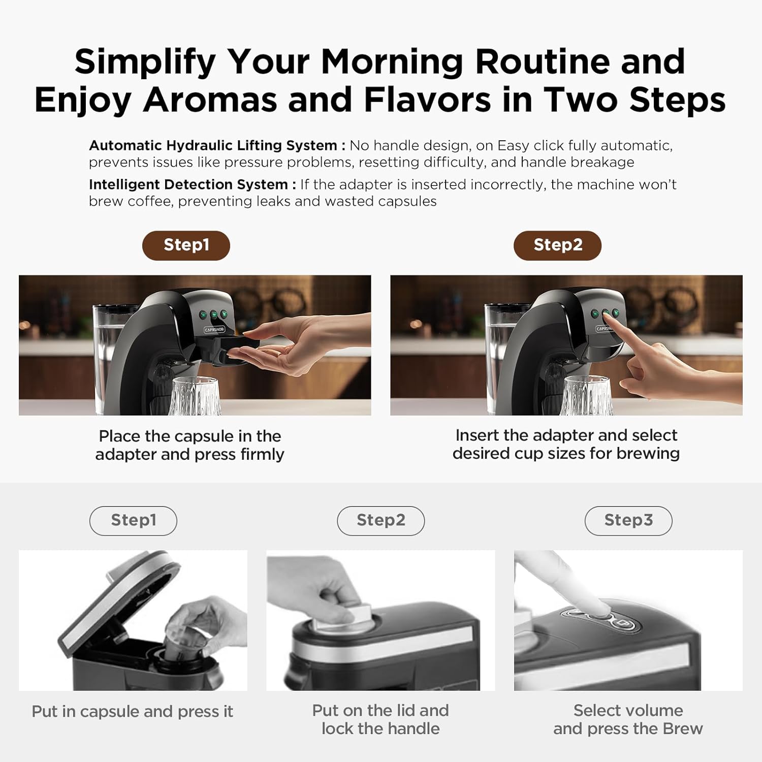 - [Automatic Hydraulic Lifting & Intelligent Detection System]: This coffee machine replaces the traditional handle with an innovative hydraulic system for effortless one-button, two-step brewing. It prevents accidental operations, pressure issues, reset difficulties, and handle breakage. If the adapter is not inserted or incorrectly inserted, the machine won’t brew, preventing leaks and wasted capsules