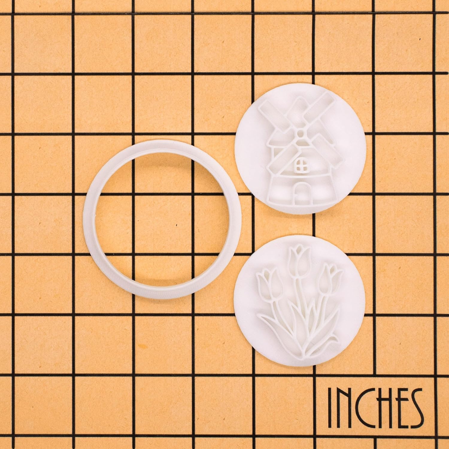 BAKERLOGY Spring Whispers - Mini 2" Cookie Cutter & Stamp Set - Tulip Garden & Windmill Design for Easter & Spring Cookies, Cupcakes & Fondant Decorations