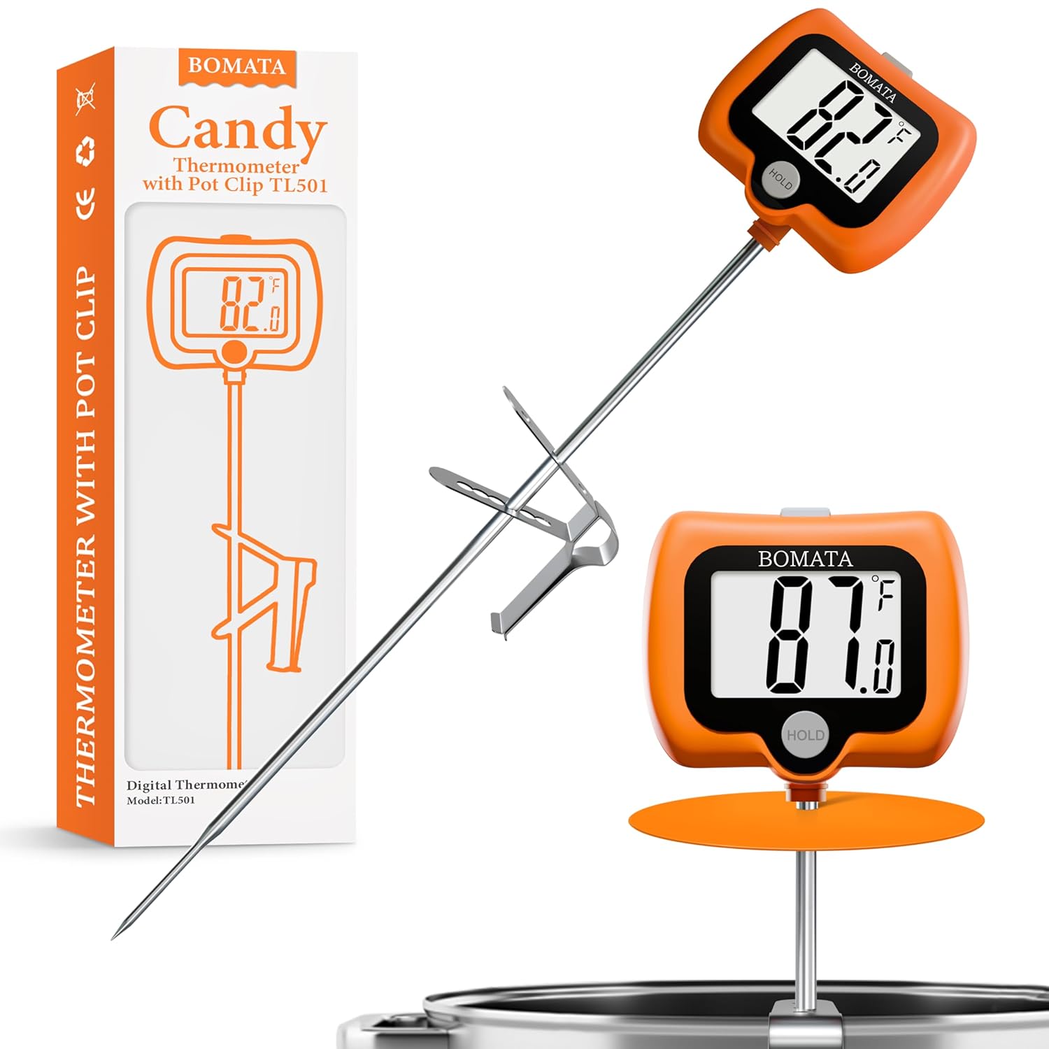 BOMATA Candy Thermometer with Pot Clip, Instant Read Cooking Thermometer with 8" Long Probe, Rotating Display, for Candy Making, Food, Candle Making, Liquids, Water, Baking, Sugar, Grilling. Orange
