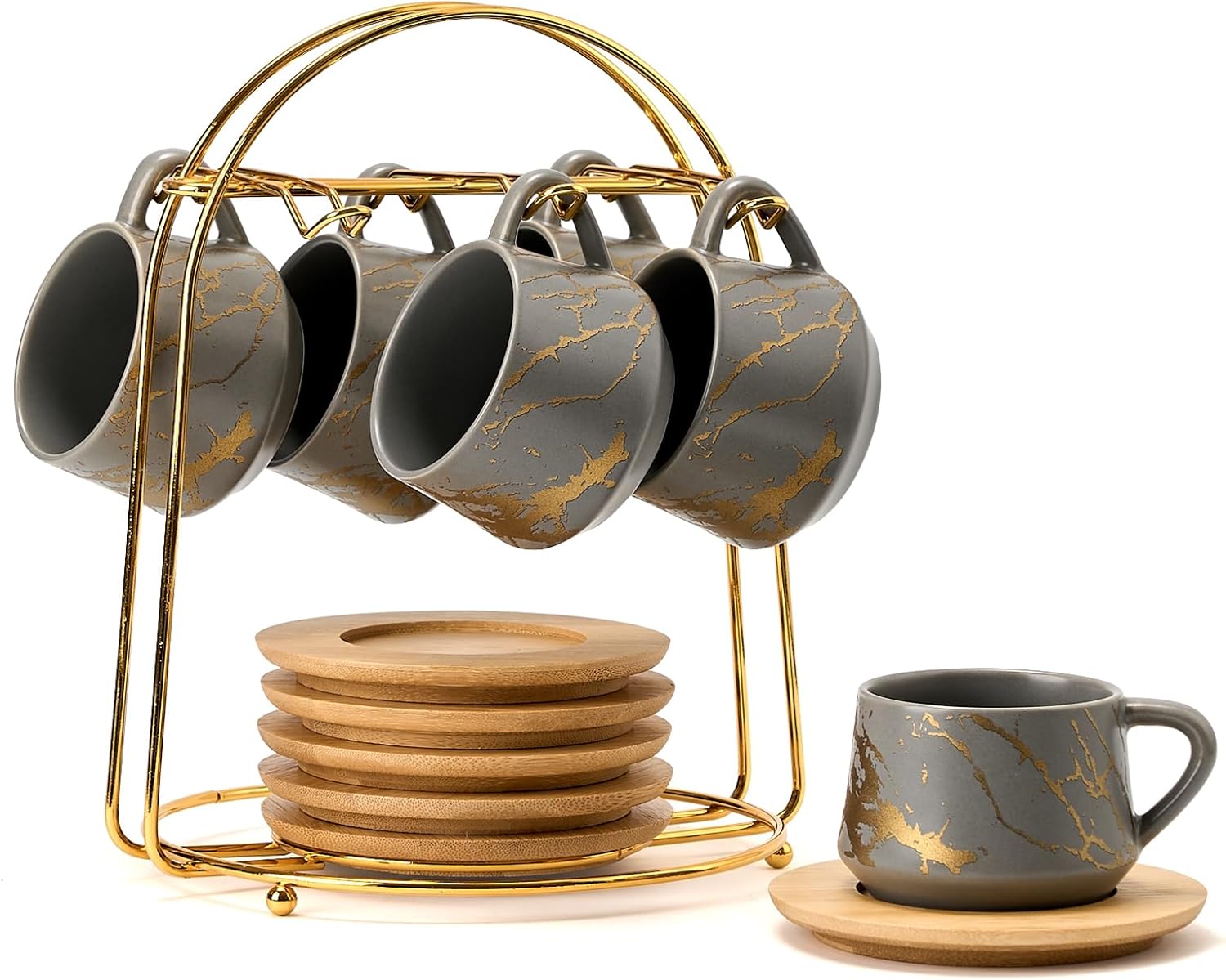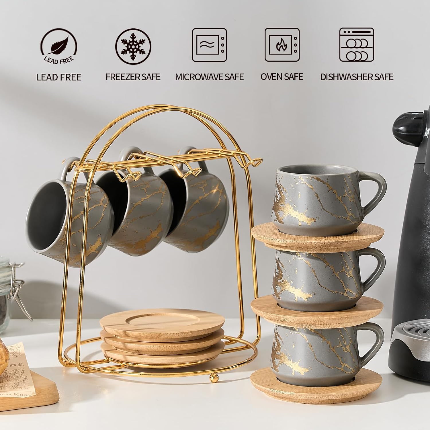LUKA Ceramic Espresso Cups with Saucers and Metal Stand, Small 4 oz Porcelain Demitasse Cups Set of 6, Cute Cappuccino Coffee Cups for Double Espresso, Tea, Marbling Gray