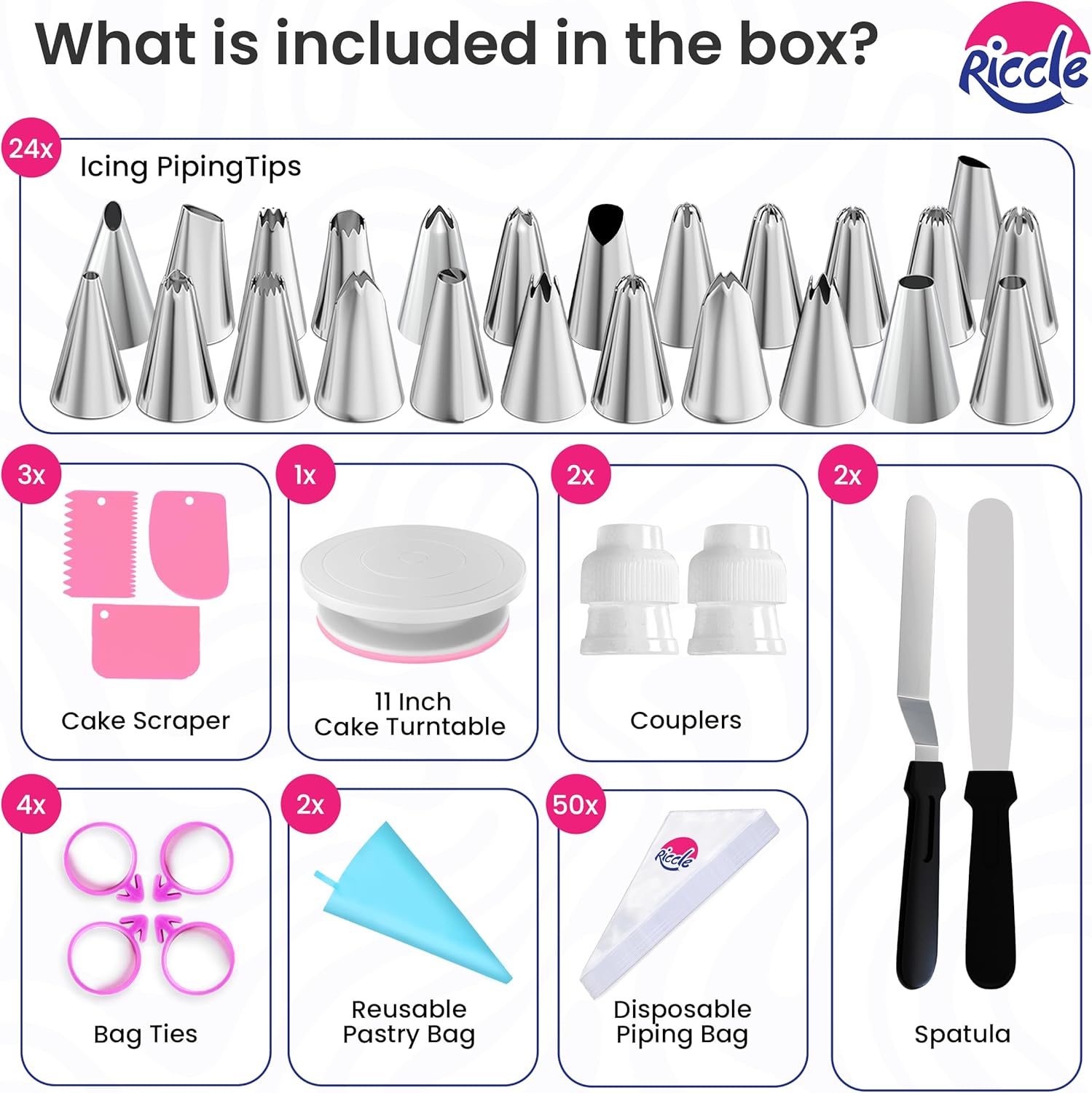 Riccle 88 pcs Cake Decorating Kit with Pink Cake Turntable - Includes 50 Disposable + 2 Reusable Piping Bags and Tips Set, 24 Icing Piping Tips, 2 Spatulas, 3 Icing Comb Scraper, Baking Supplies