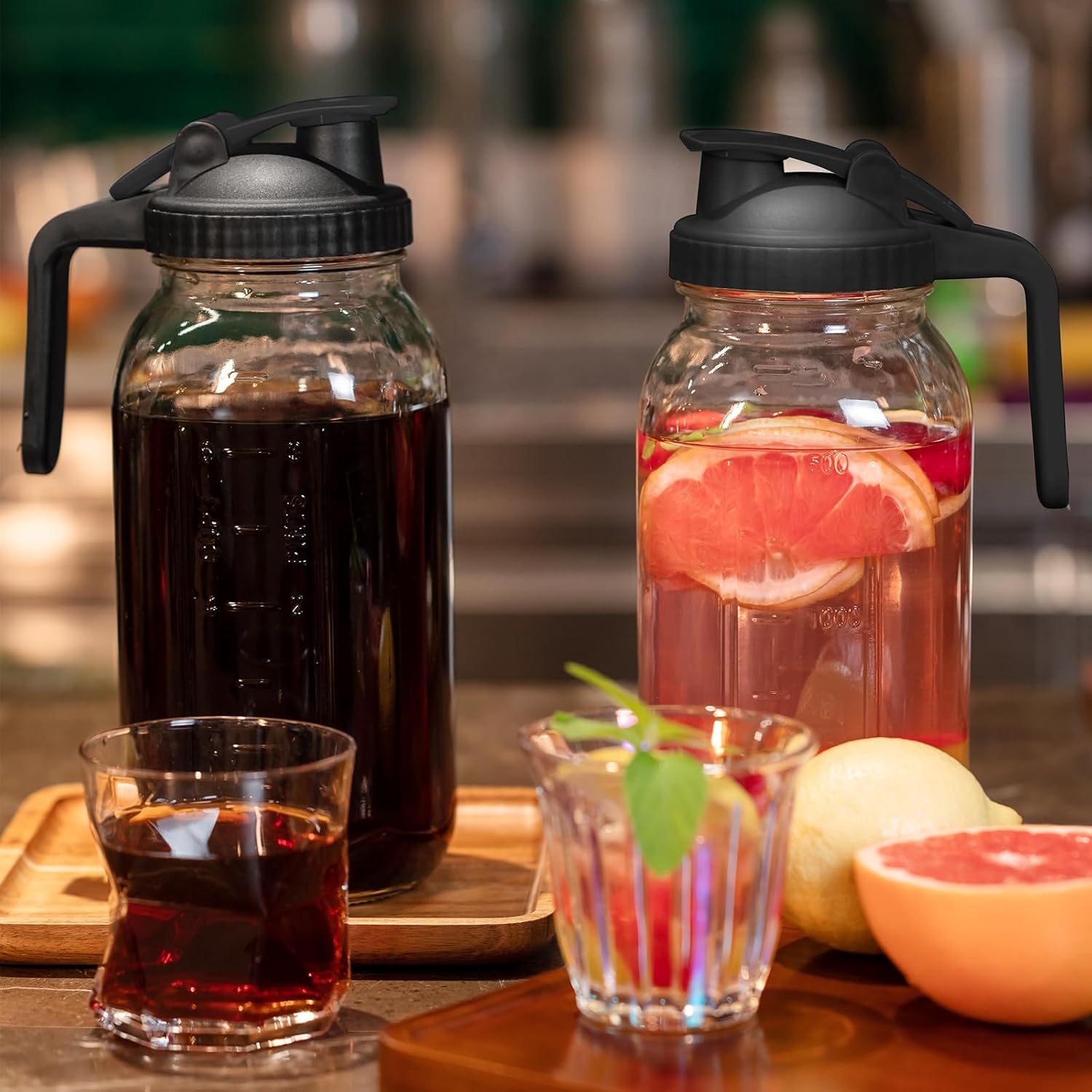 - Leak Proof & Airtight Storage: The wide mouth airtight design of our 64 Oz Glass Mason Jars Pitcher guarantees leak proof storage, perfect for keeping your beverages fresh in the fridge. Say goodbye to spills and hello to worry-free storage for all your drinks