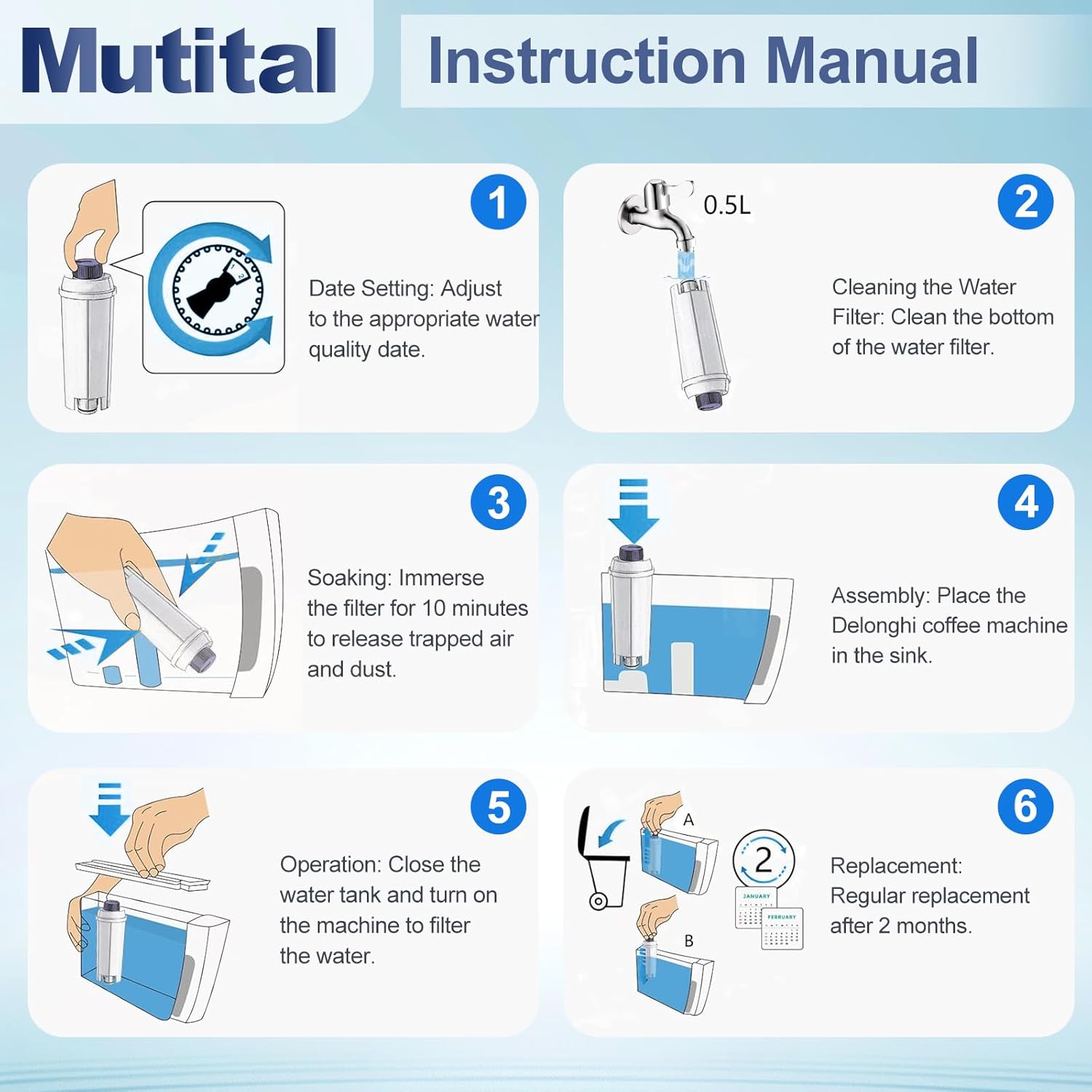 - ใ๐๐ง๐ฌ๐ญ๐ซ๐ฎ๐๐ญ๐ข๐จ๐ง๐ฌ ๐๐จ๐ซ ๐๐ฌ๐ใBefore use, soak the filter in clean tap water for 5โ10 minutes to rinse it thoroughly and release any trapped air bubbles. For the best taste and performance, we recommend replacing the filter every two months, depending on your local water quality.
