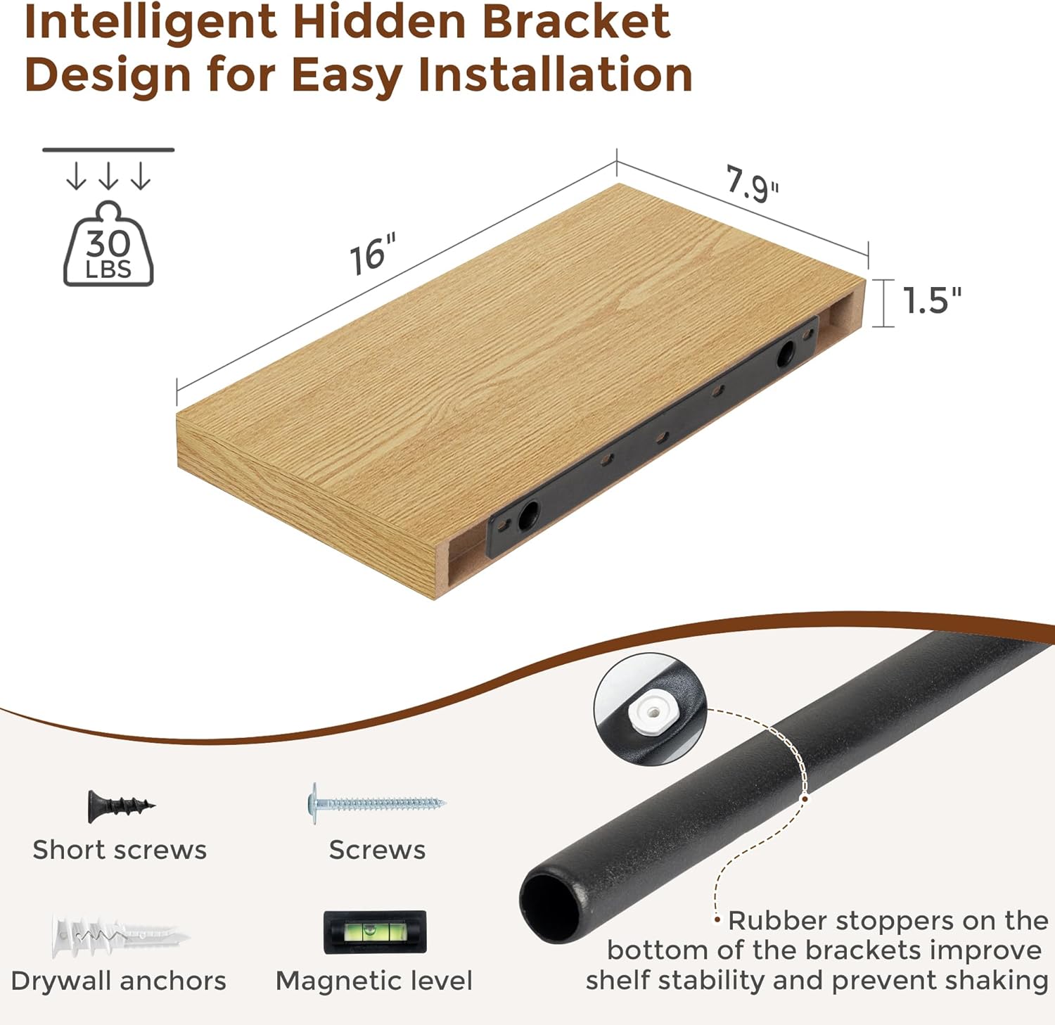 - 【Easy To Install】This oak floating shelves not only come with stainless-steel galvanized invisible brackets, but also equipped a fixing screw at the bottom to fix the shelf on the support rod, which solves the problem of sliding and is not easy to damage, and can be used for a long time. Instructions, magnetic level, drywall anchors, and screws included.