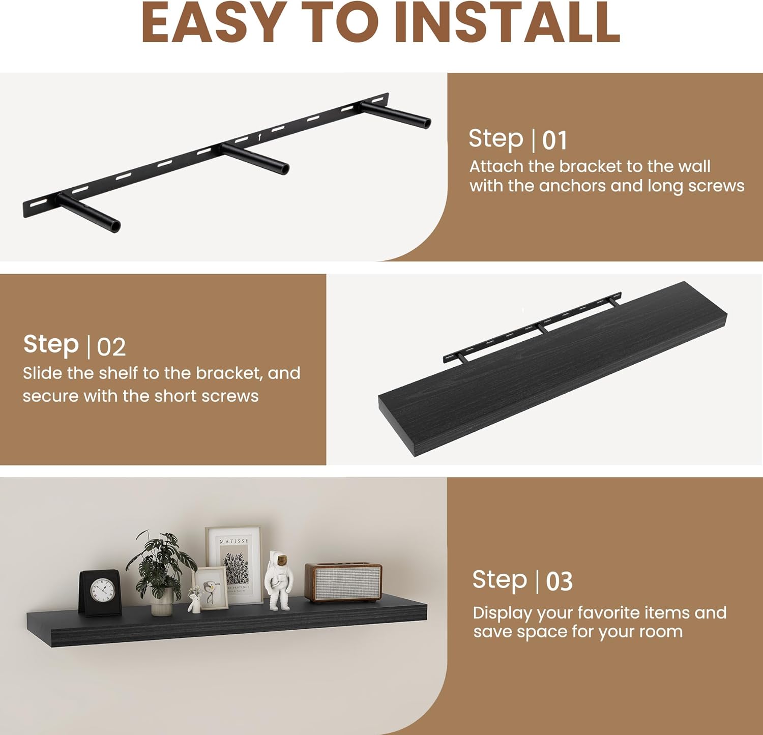 Fun Memories Rustic Real Wood Floating Shelves, 8 Inch Deep Floating Shelf Wall Mounted, 48" W x 8" D Wall Shelves Storage Shelves for Living Room, Bedroom, Bathroom, Black Finish, Set of 1