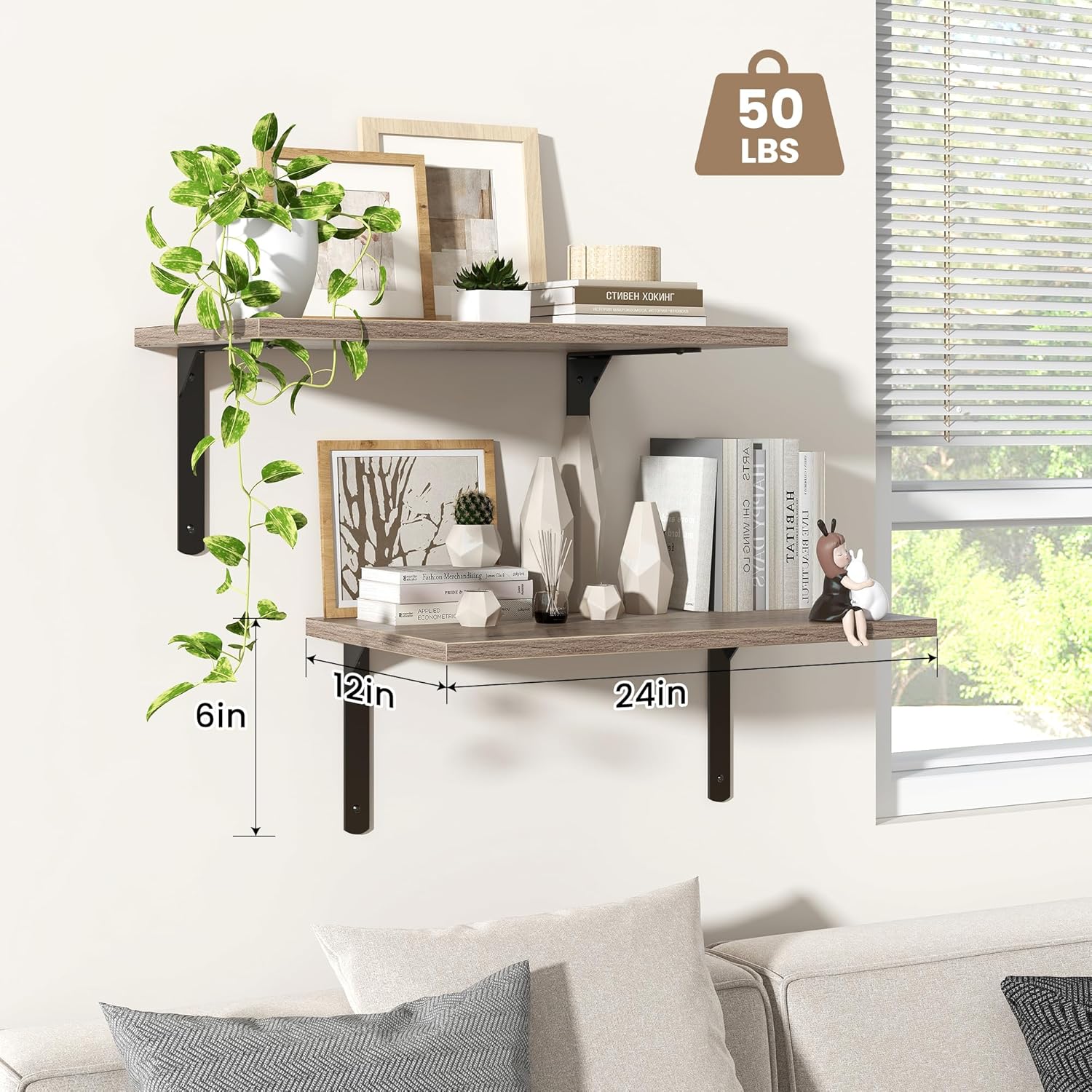Fun Memories Floating Shelves for Wall, 12 Inch Deep Floating Shelves Set of 2, Wall Mounted Shelf with Metal Brackets, Rustic Wood Wide Shelf for Bathroom, Kitchen and Living Room, Grey, 24W x 12D