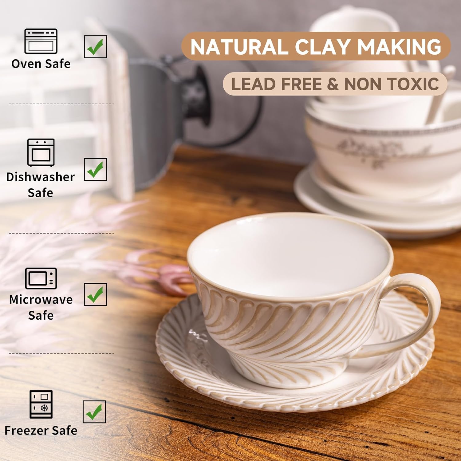 Ceramic Latte Cup with Saucer, 12 OZ Cappuccino Cup Vintage Cafe Art Cups for Espresso Turkish Coffee, Farmhouse Latte Mugs Tea Cups and Saucers Porcelain Set for Baristas Great Gift