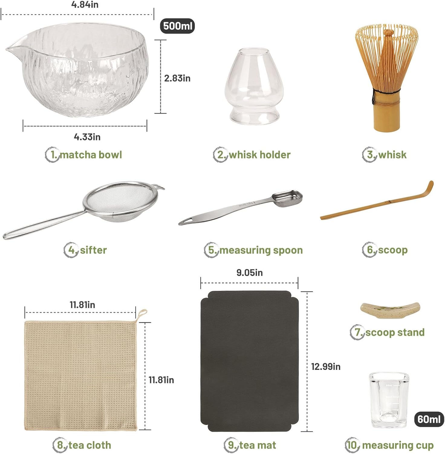 10-Pcs Matcha Kit Set, Whisk and Bowl with Spout & Measuring Spoon, Japanese Matcha Tea Making Tools, Transparent Textured Glass
