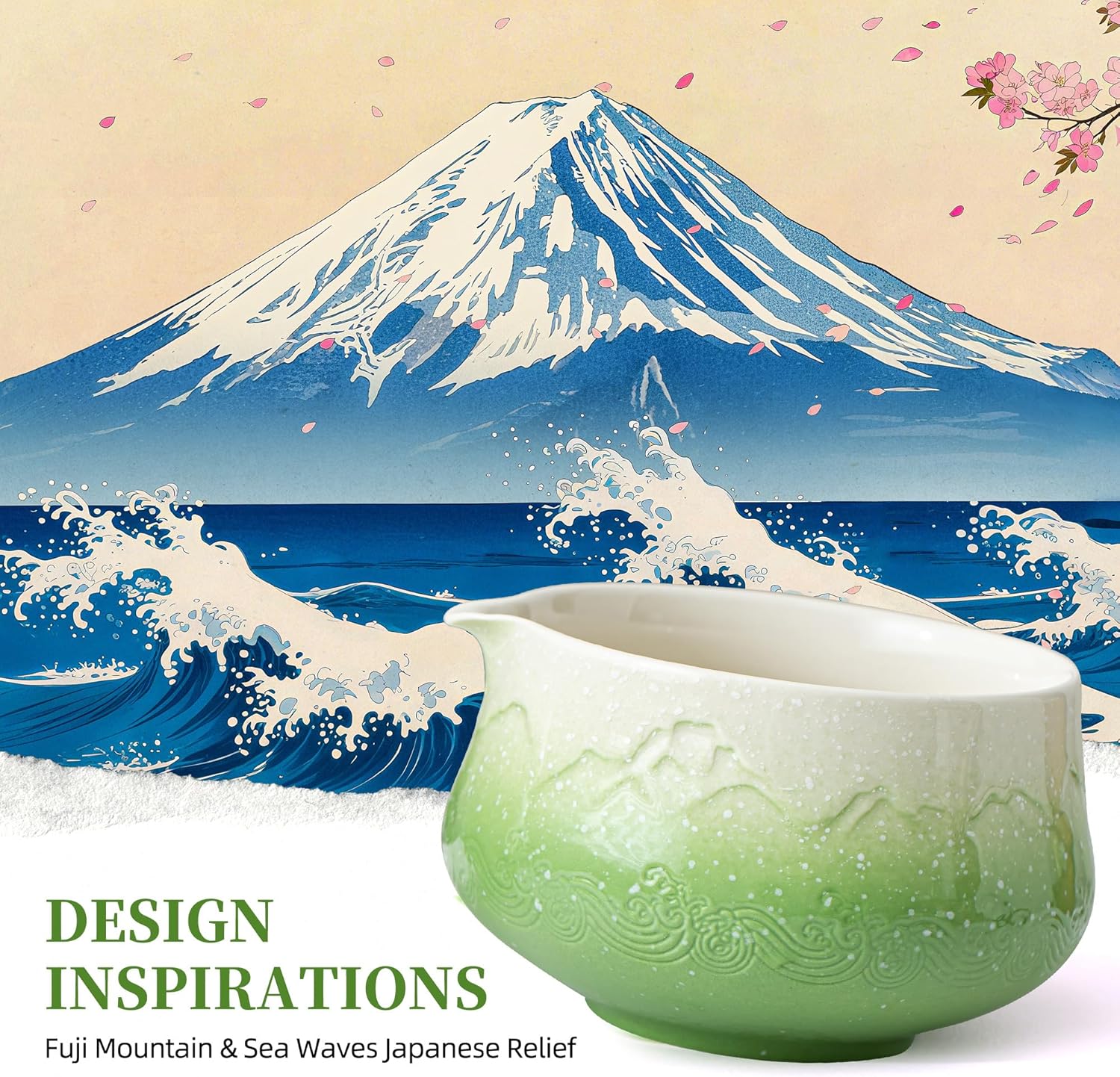 TEANAGOO 7 Pcs Matcha Whisk Set,Green Matcha Set, Ceremony Matcha Powder Kit,Matcha Tea Set for Making Latte,Matcha Whisk Set and Bowl with Scoop&Sifter,Fuji Design Ceramic Bowl,Gift for Matcha Lovers