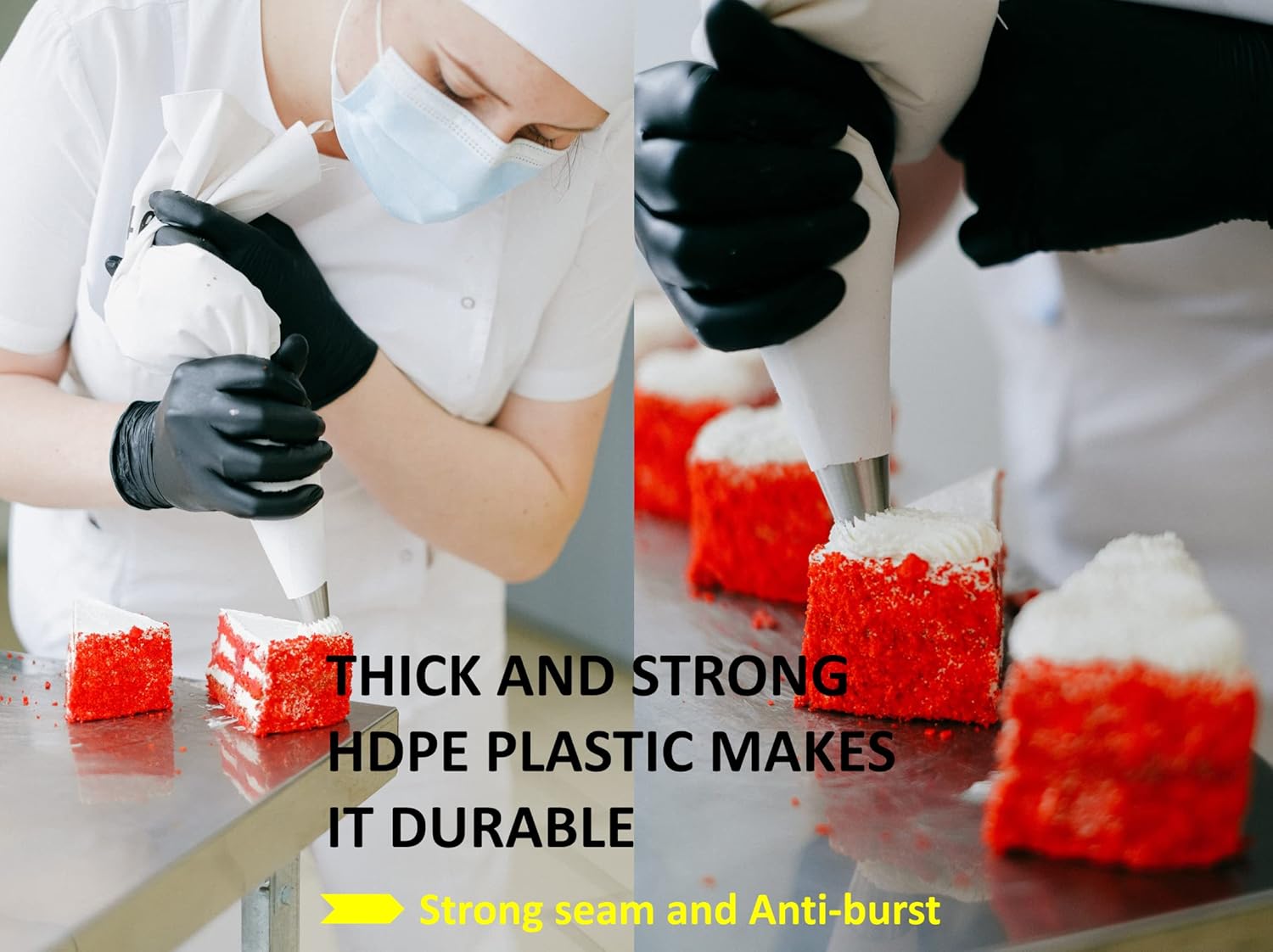 - 【Thick and Sturdy-Anti-burst】: These thick sturdy pastry piping bags are made of food grade plastic material and specially thickened. Now you can squeeze and pressure freely without being afraid of leaking or bursting that happened a lot to your old piping bags. Your projects won’t be ruined anymore