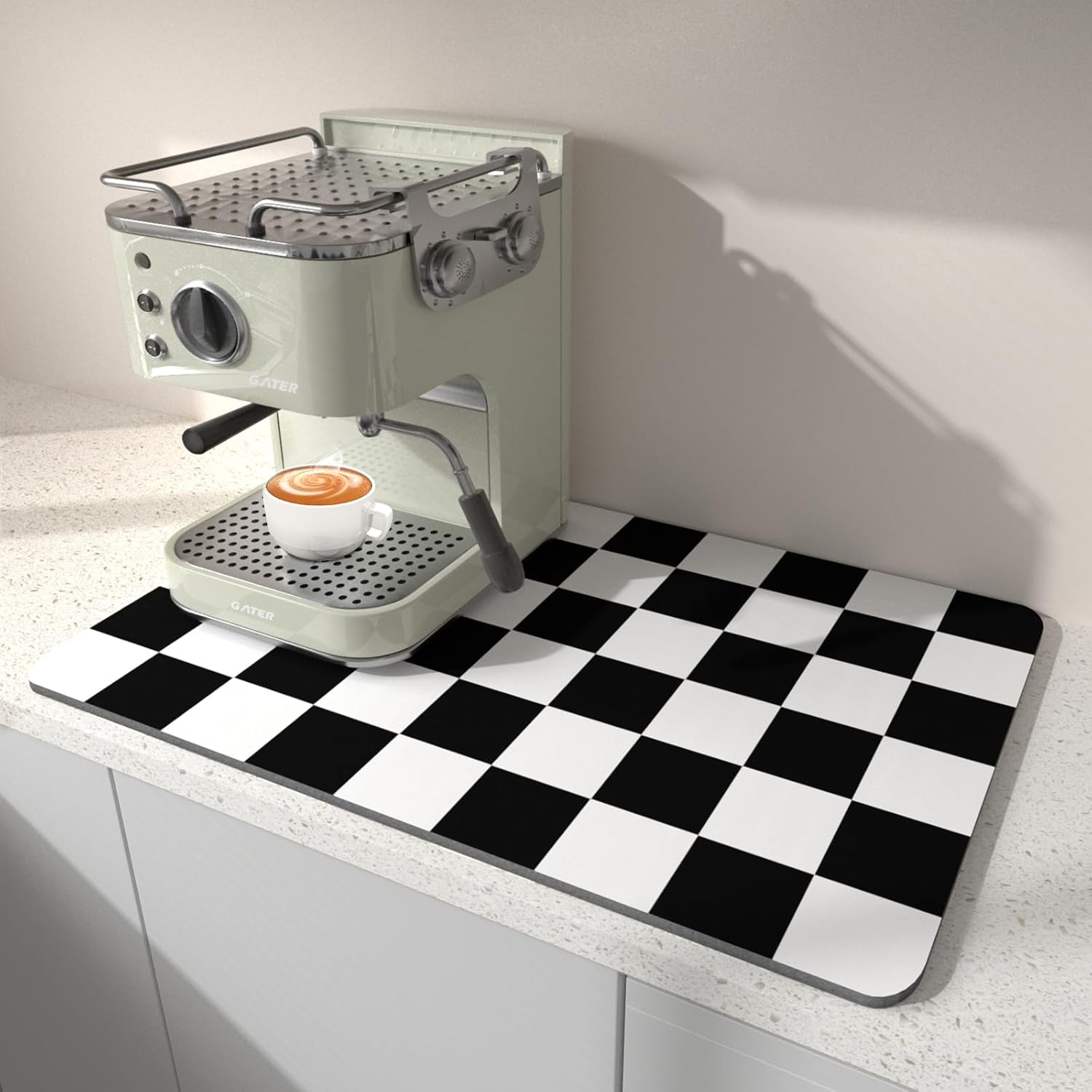 BLESWIN Dish Drying Mat for Kitchen, 15.7’’ X 17.7’’ Coffee Bar Mats for Countertop Fit Under Coffee Maker, Hide Stain Rubber Backed Espresso Machine Absorbent Drying Pad, Black & White