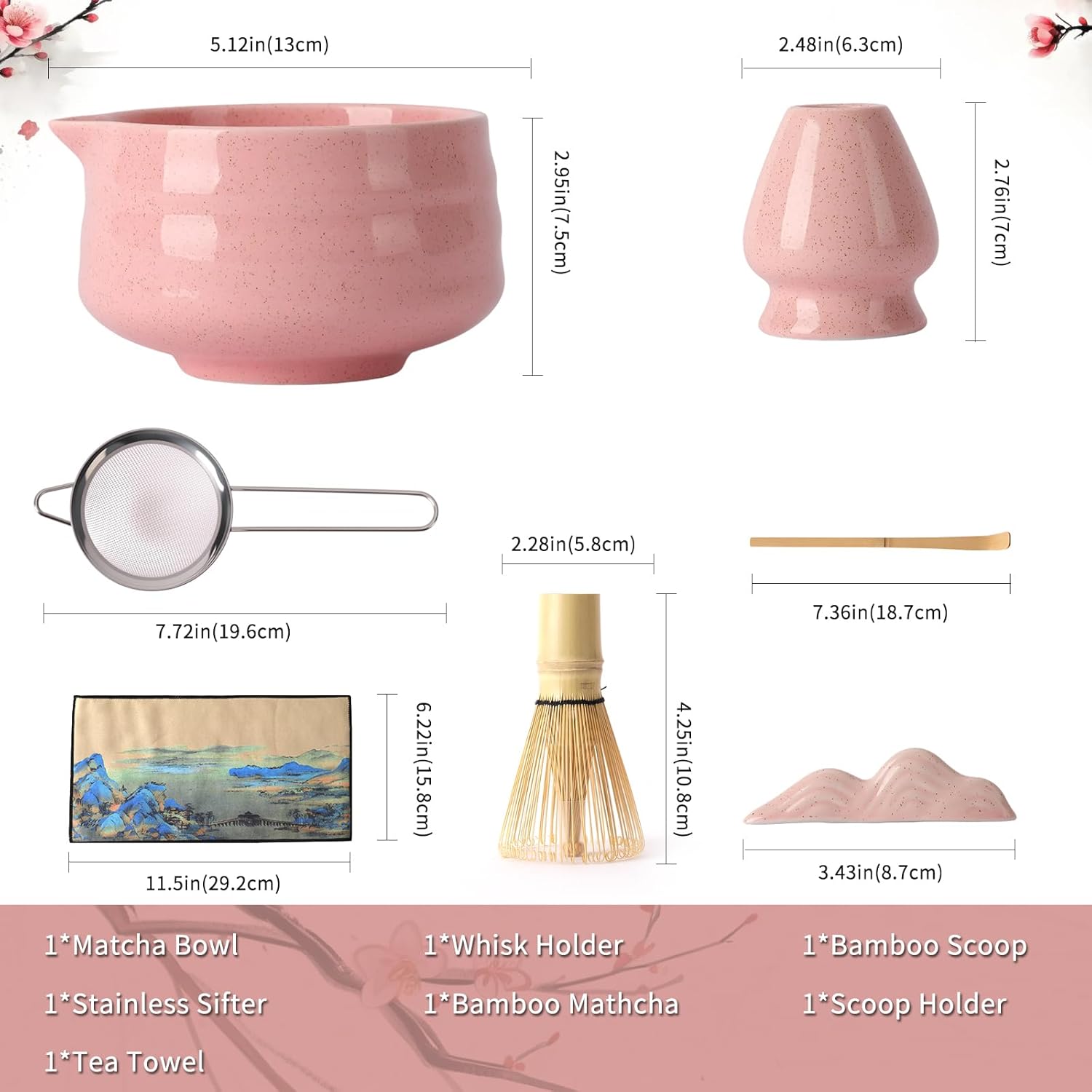 Japanese Matcha Whisk Set - 7-Piece Kit Bamboo Chasen, Ceramic Bowl with Spout, Stainless Steel Sifter & Holder Pink
