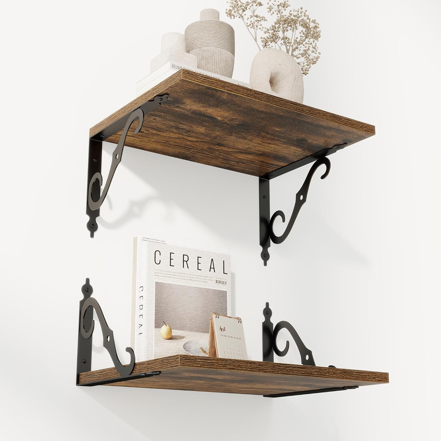 - 12 Inch Deep Floating Shelves: Our rustic deep floating shelves are made of high-quality particle board and sturdy brackets. The classic S-shaped brackets are designed to prevent sagging and ensure long-lasting stability. All edges are carefully sanded for a smooth finish