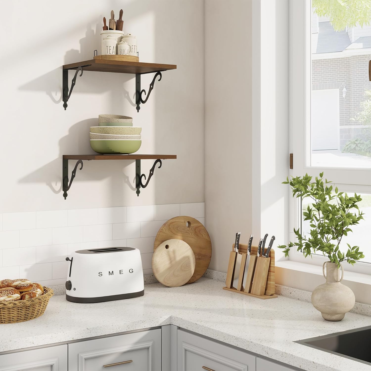 - 12 Inch Deep Floating Shelves: Our rustic deep floating shelves are made of high-quality particle board and sturdy brackets. The classic S-shaped brackets are designed to prevent sagging and ensure long-lasting stability. All edges are carefully sanded for a smooth finish