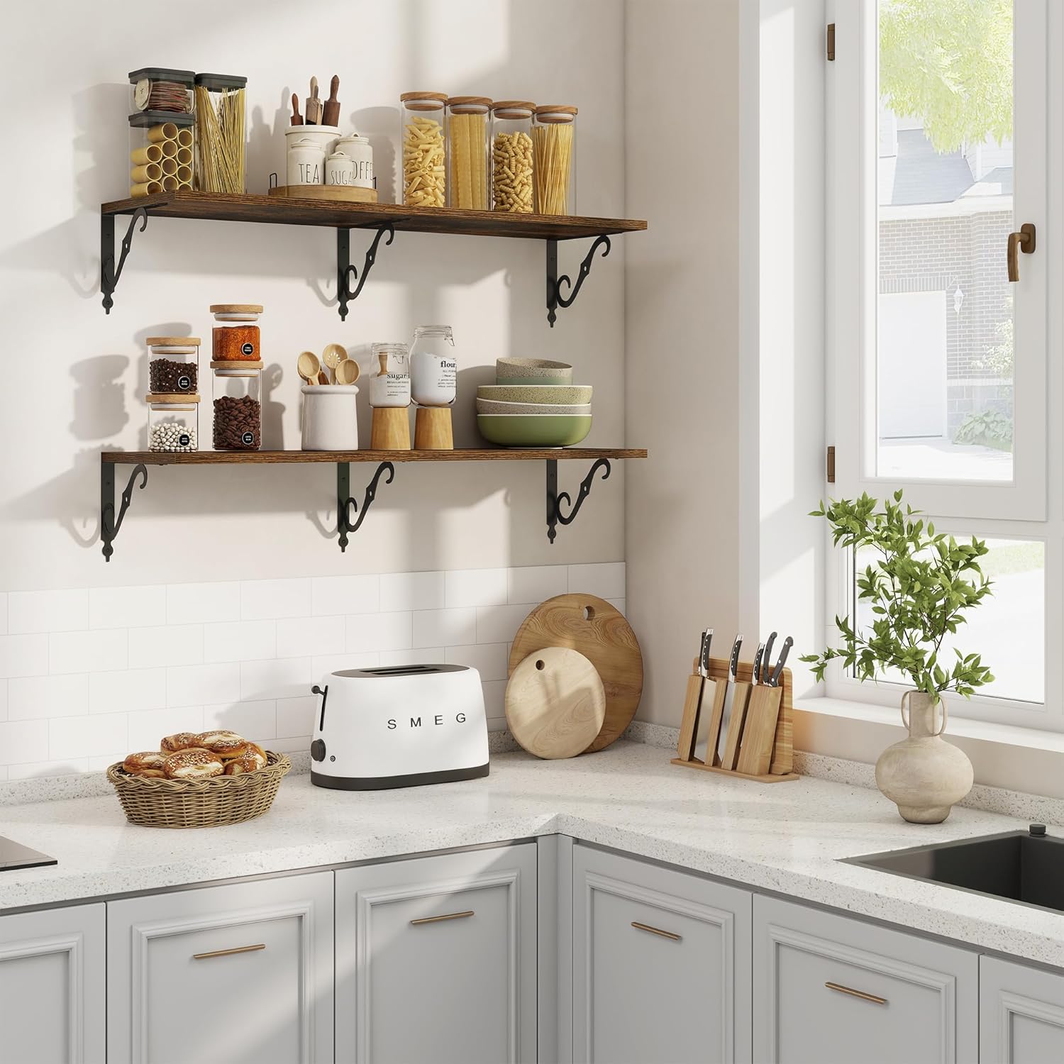 - 12 Inch Deep Floating Shelves: Our rustic deep floating shelves are made of high-quality particle board and sturdy brackets. The classic S-shaped brackets are designed to prevent sagging and ensure long-lasting stability. All edges are carefully sanded for a smooth finish