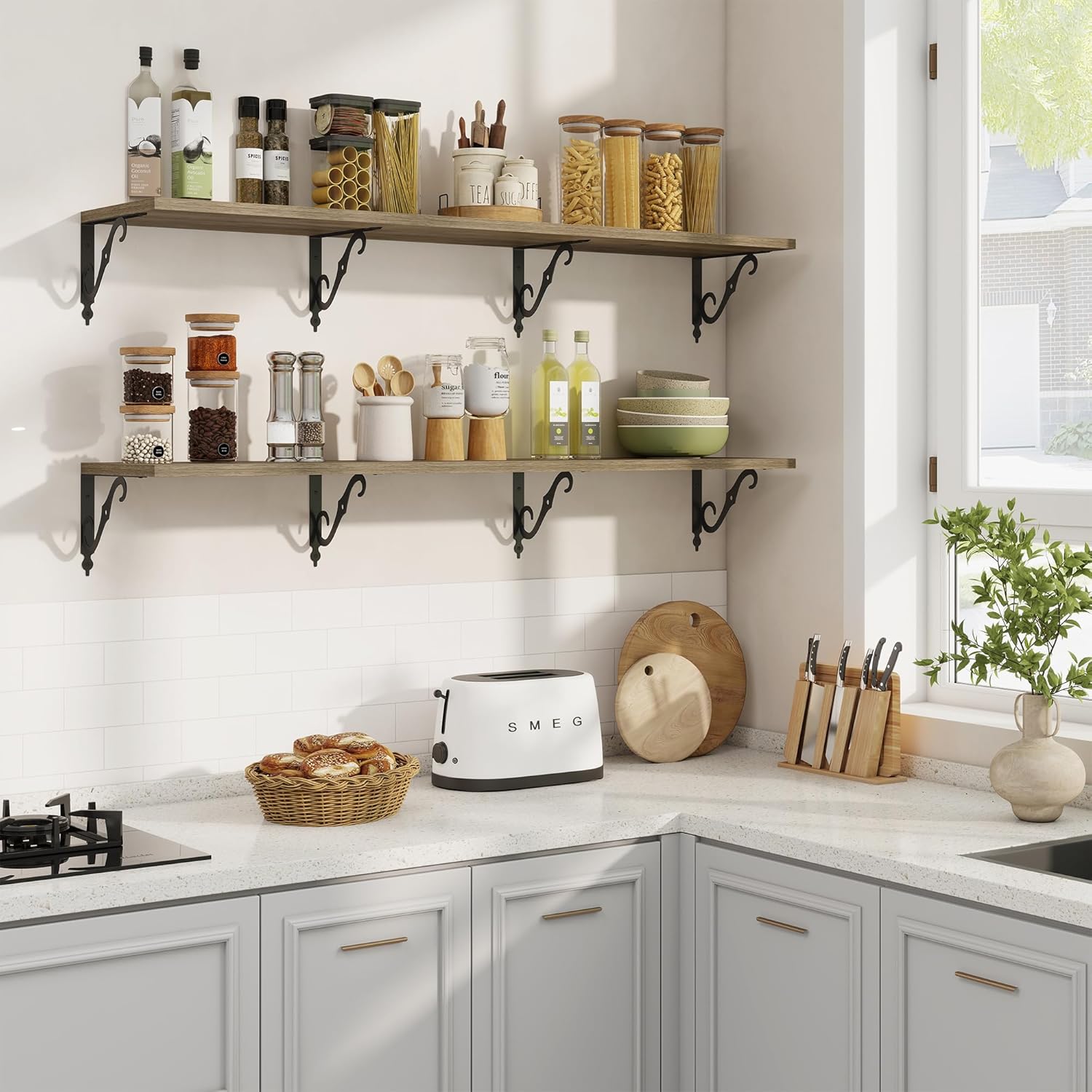 - 12 Inch Deep Floating Shelves: Our rustic deep floating shelves are made of high-quality particle board and sturdy brackets. The classic S-shaped brackets are designed to prevent sagging and ensure long-lasting stability. All edges are carefully sanded for a smooth finish