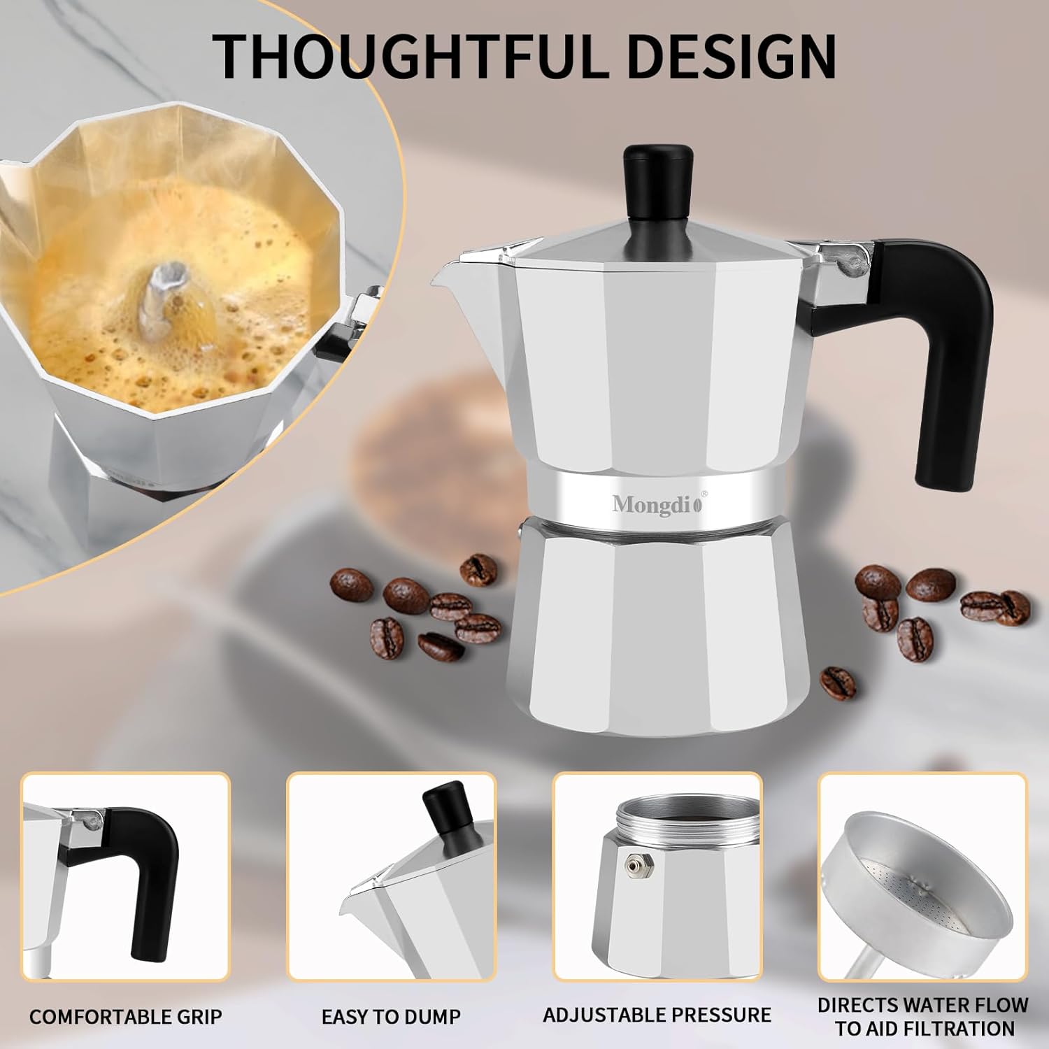 Mongdio Stovetop Espresso Maker Moka Pot, Stove Top Cuban Coffee Maker, Italian Greca Mocha Pot, 3 Espresso Cups, 5 oz - Silver